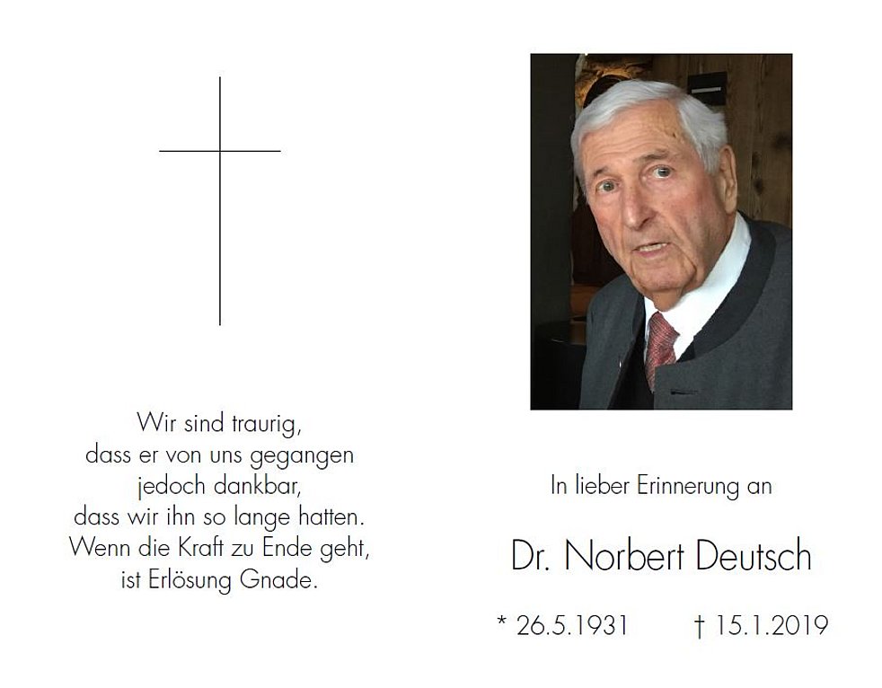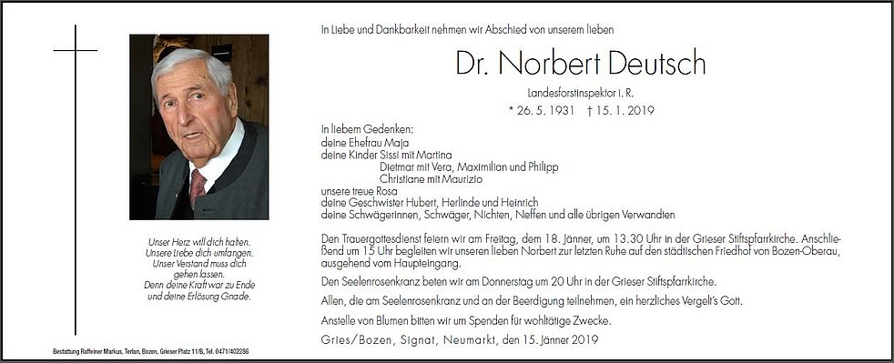 Den Trauergottesdienst feiern wir am Freitag, dem 18. Jänner, um 13.30 Uhr in der Grieser Stiftspfarrkirche. Anschlieβend um 15 Uhr begleiten wir unseren lieben Norbert zur letzten Ruhe auf den städtischen Friedhof von Bozen-Oberau, ausgehend vom Haupteingang.