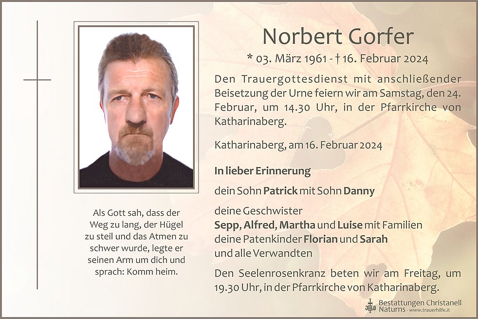 Den Trauergottesdienst mit anschließender Beisetzung der Urne feiern wir am Samstag, den 24. Februar, um 14.30 Uhr, in der Pfarrkirche von Katharinaberg.