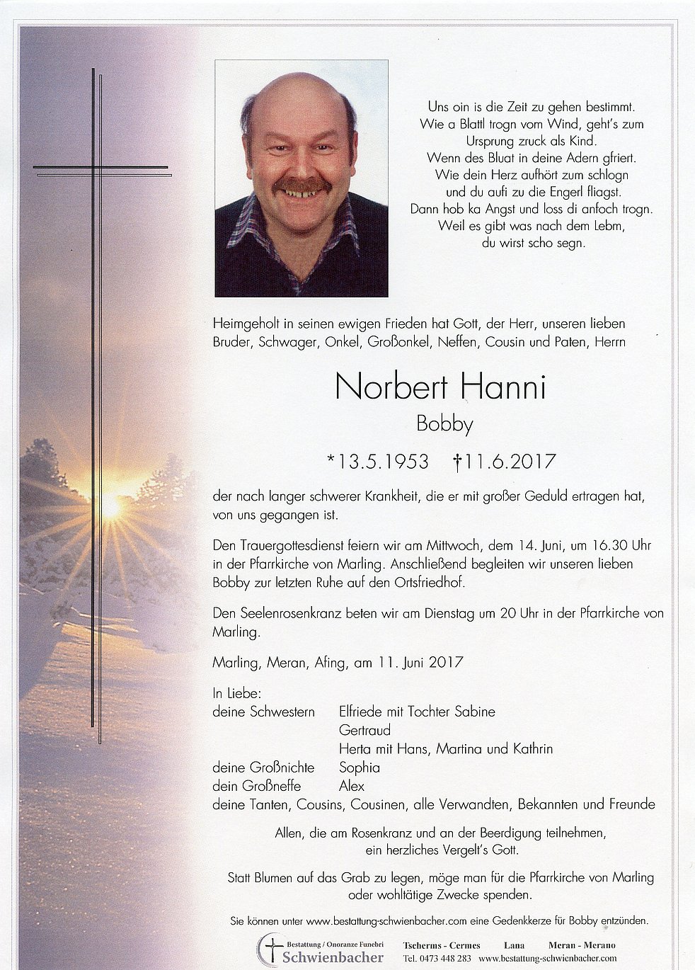 Statt Blumen auf das Grab zu legen, möge man für die Pfarrkirche von Marling oder wohltätige Zwecke spenden.