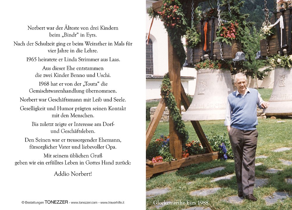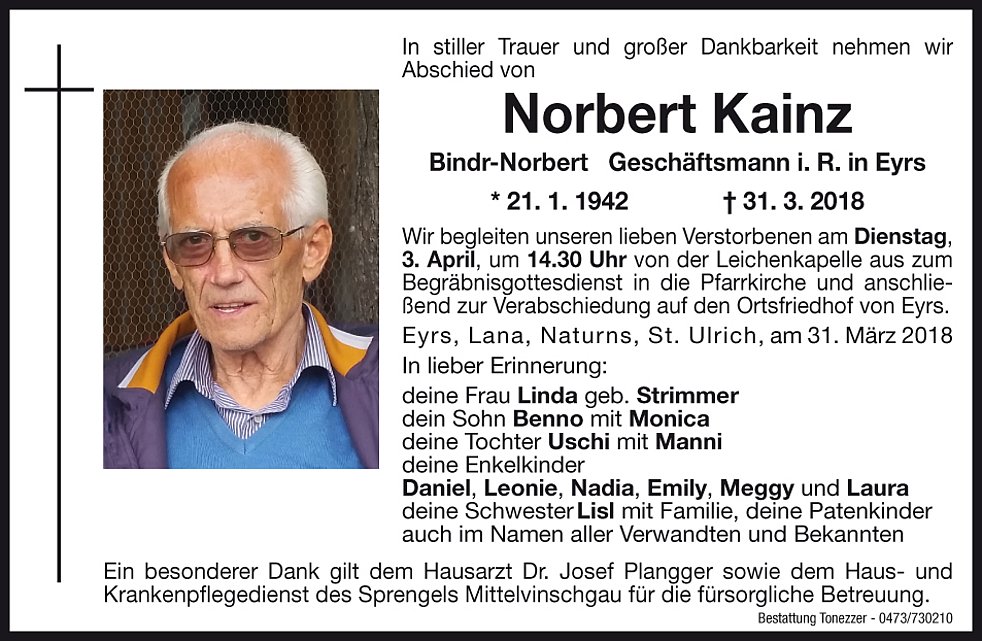 Ein besonderer Dank gilt dem Hausarzt Dr. Josef Plangger sowie dem Haus- und Krankenpflegedienst des Sprengels Mittelvinschgau für die fürsorgliche Betreuung.