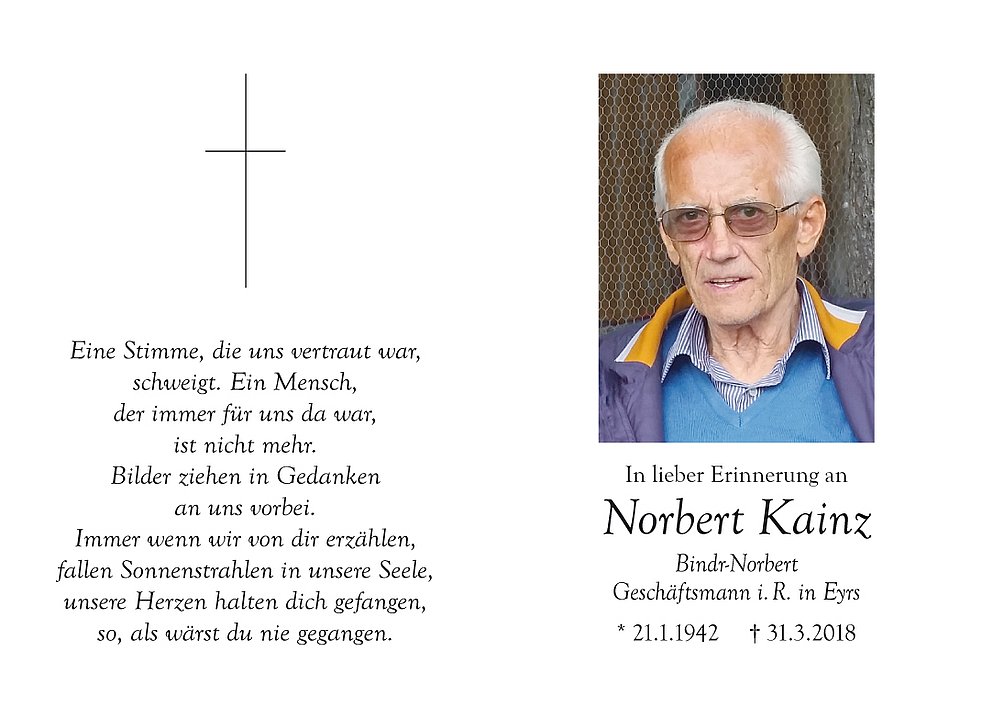 Wir begleiten unseren lieben Verstorbenen am Dienstag, 3. April, um 14.30 Uhr von der Leichenkapelle aus zum Begräbnisgottesdienst in die Pfarrkirche und anschließend zur Verabschiedung auf den Ortsfriedhof von Eyrs.