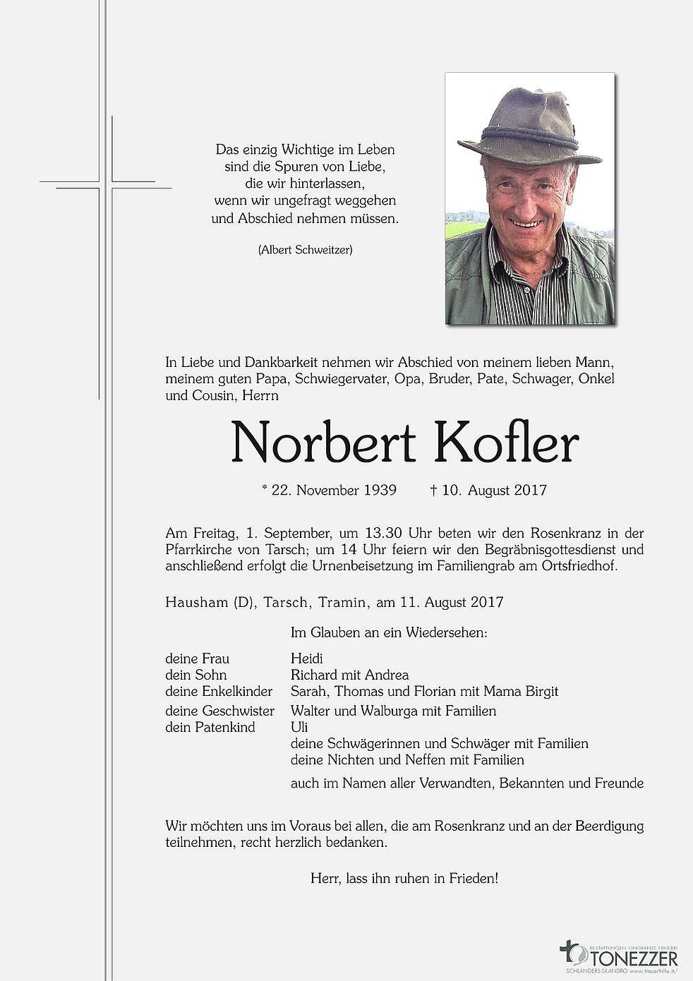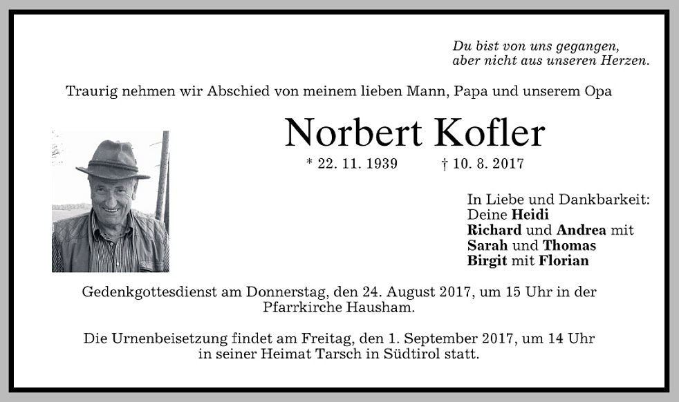 Am Freitag, 1. September, um 13.30 Uhr beten wir den Rosenkranz in der Pfarrkirche von Tarsch; um 14 Uhr feiern wir den Begräbnisgottesdienst und anschließend erfolgt die Urnenbeisetzung im Familiengrab am Ortsfriedhof.