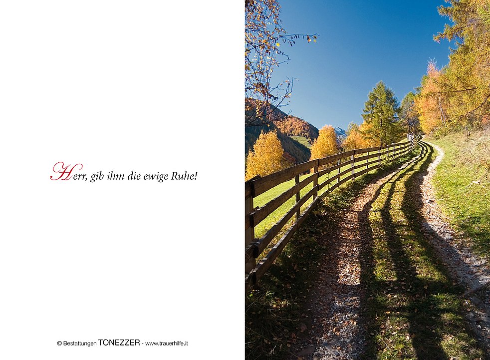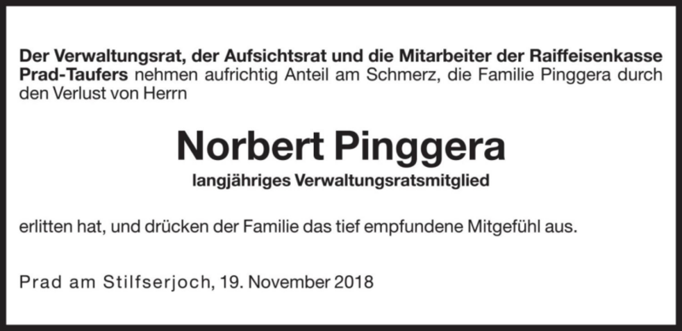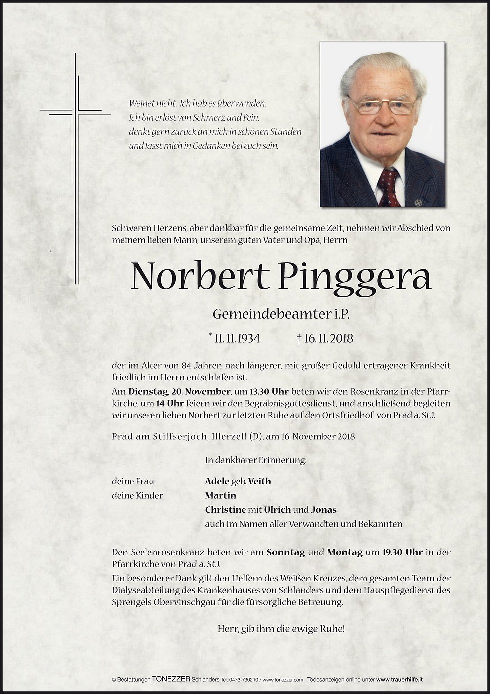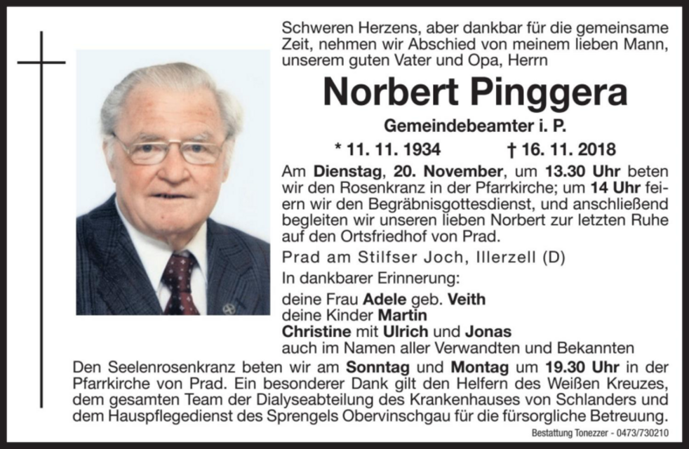Am Dienstag, 20. November, um 13.30 Uhr beten wir den Rosenkranz in der Pfarrkirche; um 14 Uhr feiern wir den Begräbnisgottesdienst, und anschließend begleiten wir unseren lieben Norbert zur letzten Ruhe auf den Ortsfriedhof von Prad a. StJ.