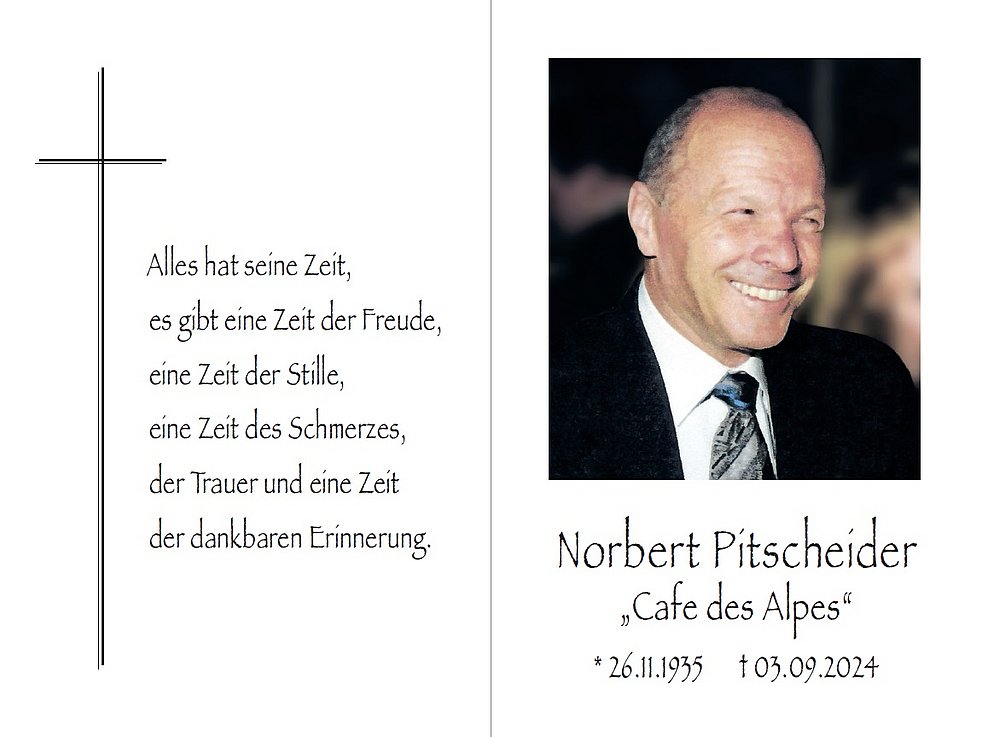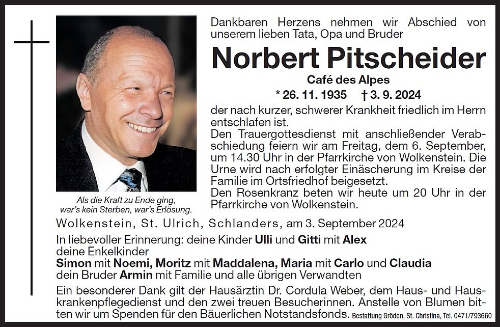 Den Trauergottesdienst mit anschließender Verabschiedung feiern wir am Freitag, dem 06. September, um 14.30 Uhr in der Pfarrkirche von Wolkenstein. Die Urne wird nach erfolgter Einäscherung im Kreise der Familie im Ortsfriedhof beigesetzt.