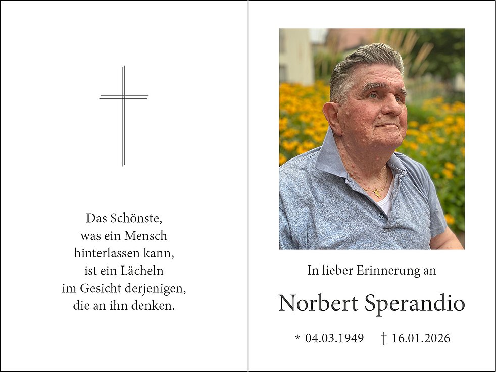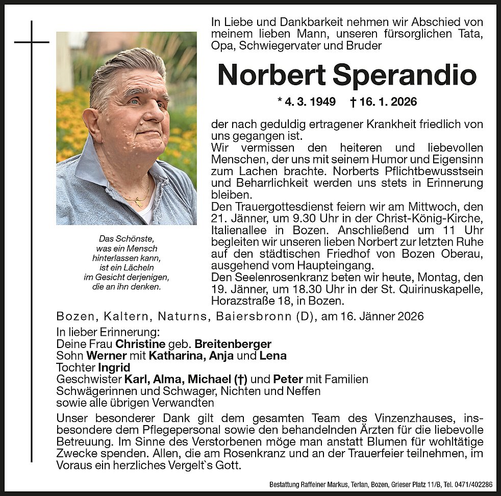 Den Trauergottesdienst feiern wir am Mittwoch, den 21. Jänner, um 9.30 Uhr in der Christ-König-Kirche, Italienallee in Bozen. Anschließend um 11 Uhr begleiten wir unseren lieben Norbert zur letzten Ruhe auf den städtischen Friedhof von Bozen Oberau, ausgehend vom Haupteingang.