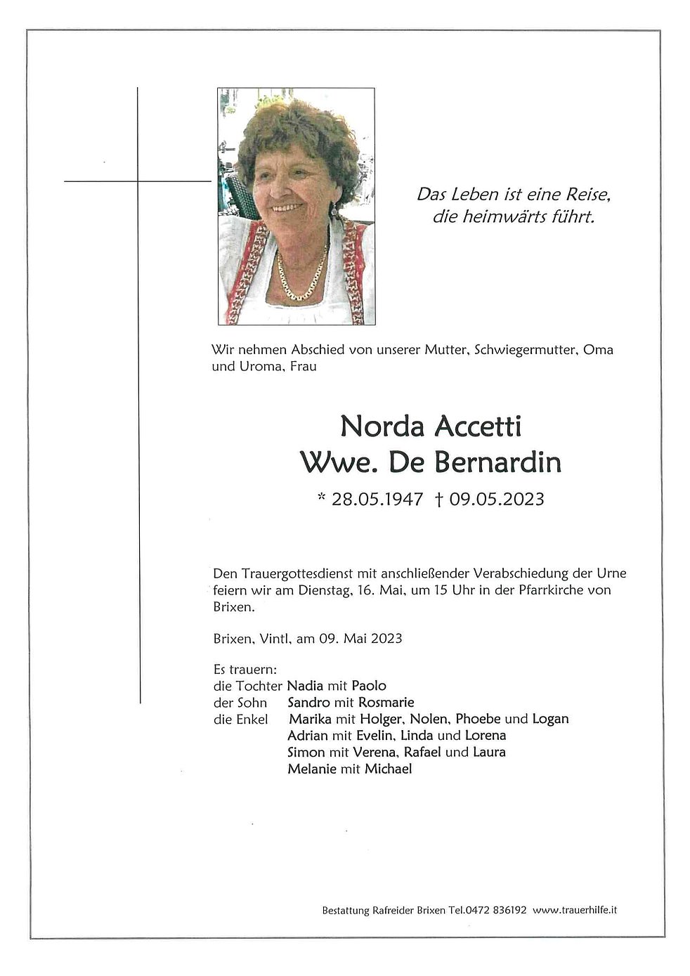 Trauerfeier: 16.05. - 15:00 Uhr Pfarrkirche Brixen