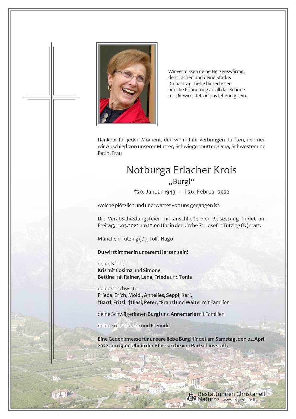Eine Gedenkmesse für unsere liebe Burgl findet am Samstag, den 02.April 2022, um 19.00 Uhr in der Pfarrkirche von Partschins statt.