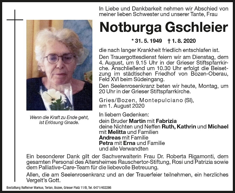 Den Trauergottesdienst feiern wir am Dienstag, den 4. August, um 9.15 Uhr in der Grieser Stiftspfarrkirche. Anschlieβend um 10.30 Uhr erfolgt die Beisetzung im städtischen Friedhof von Bozen-Oberau, Feld XVI beim Südeingang.