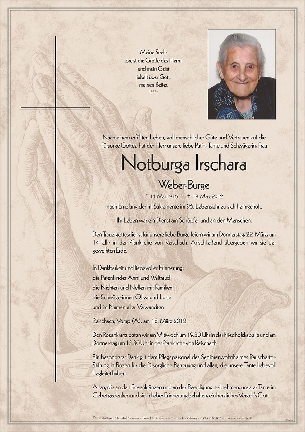 Den Trauergottesdienst für unsere liebe Burge feiern wir am Donnerstag, 22. März, um 14 Uhr in der Pfarrkirche von Reischach. Anschließend übergeben wir sie der geweihten Erde.