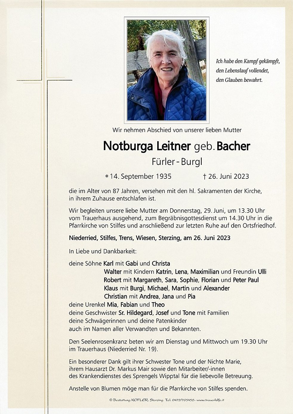 Wir begleiten unsere liebe Mutter am Donnerstag, 29. Juni, um 13.30 Uhr vom Trauerhaus ausgehend, zum Begräbnisgottesdienst um 14.30 Uhr in die Pfarrkirche von Stilfes und anschließend zur letzten Ruhe auf den Ortsfriedhof.