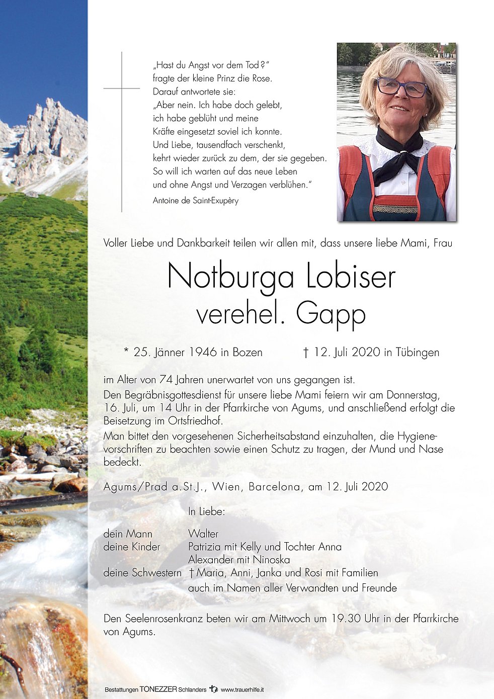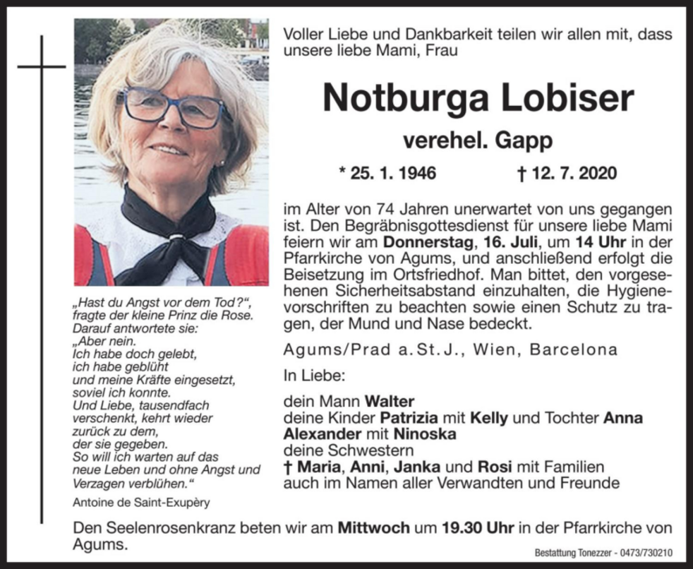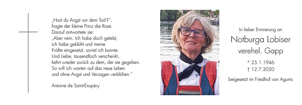 um 14 Uhr in der Pfarrkirche von Agums, und anschließend erfolgt die Beisetzung im Ortsfriedhof.
