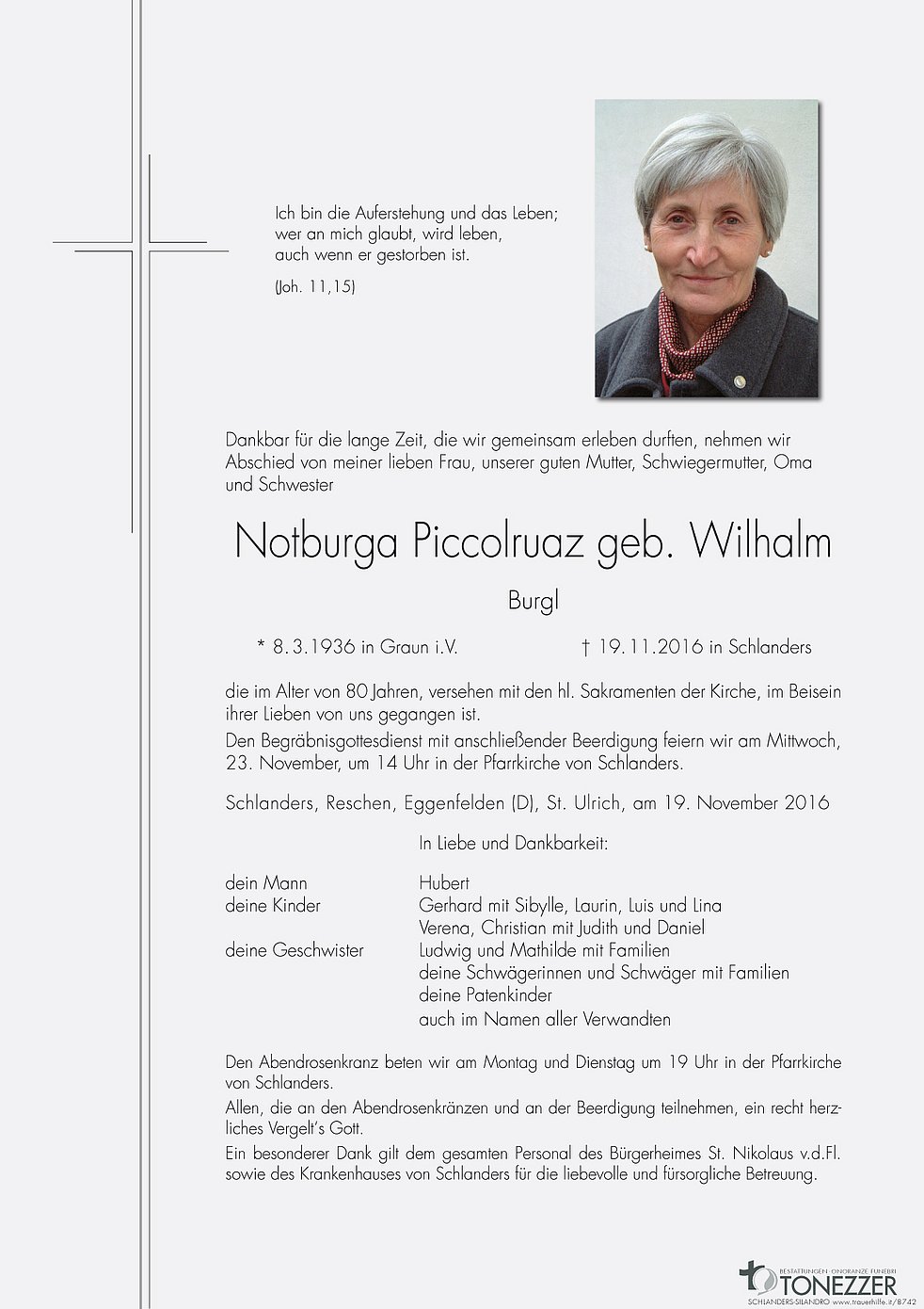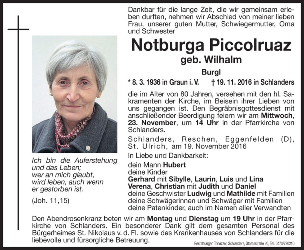 Den Begräbnisgottesdienst mit anschließender Beerdigung feiern wir am Mittwoch, 23. November, um 14 Uhr in der Pfarrkirche von Schlanders.