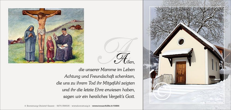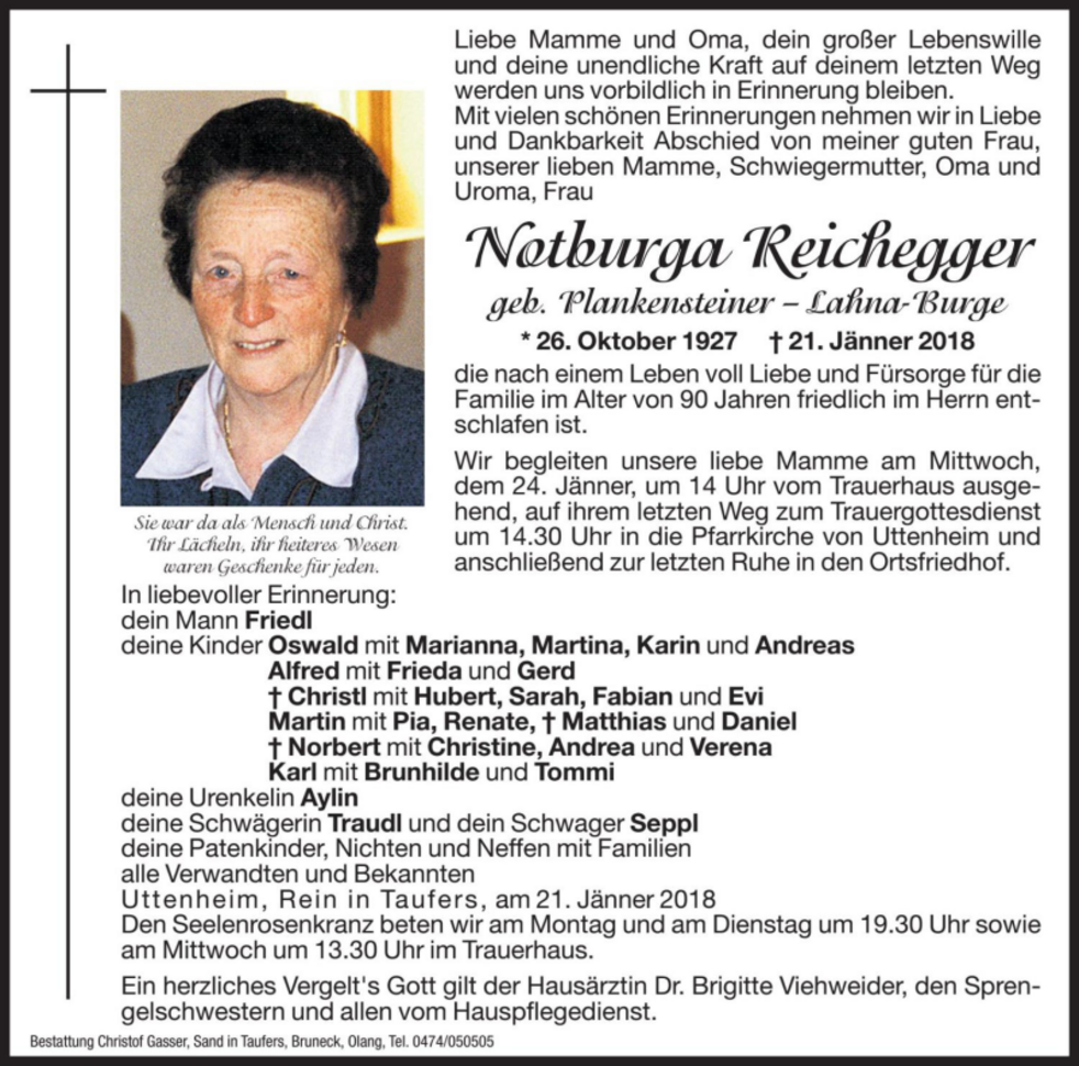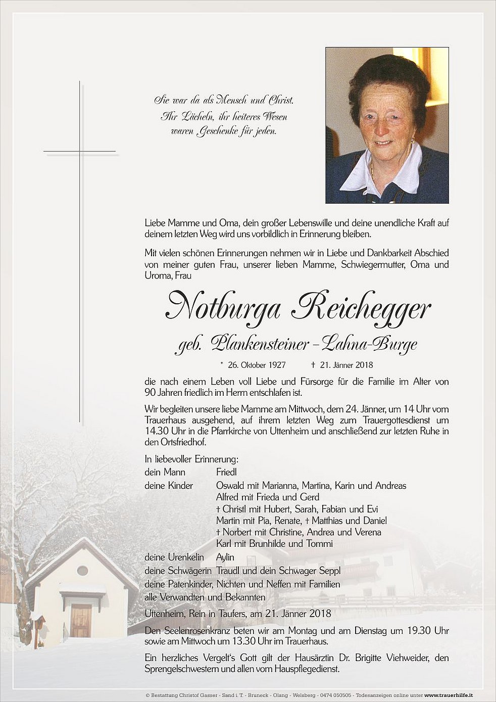 Wir begleiten unsere liebe Mamme am Mittwoch, dem 24. Jänner, um 14 Uhr vom Trauerhaus ausgehend, auf ihrem letzten Weg zum Trauergottesdienst um 14.30 Uhr in die Pfarrkirche von Uttenheim und anschließend zur letzten Ruhe in den Ortsfriedhof.