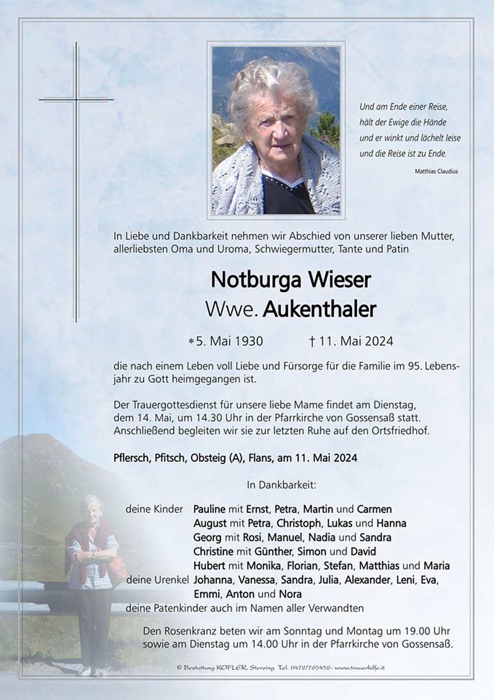 Der Trauergottesdienst für unsere liebe Mame findet am Dienstag, dem 14. Mai, um 14.30 Uhr in der Pfarrkirche von Gossensaß statt. Anschließend begleiten wir sie zur letzten Ruhe auf den Ortsfriedhof.