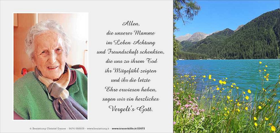 Ein herzlicher Dank für die liebevolle Betreuung gilt dem Ärzteteam und dem gesamten Personal vom Wohn- und Pflegeheim Bruneck, insbesondere allen Bediensteten vom 2. Wohnbereich.
