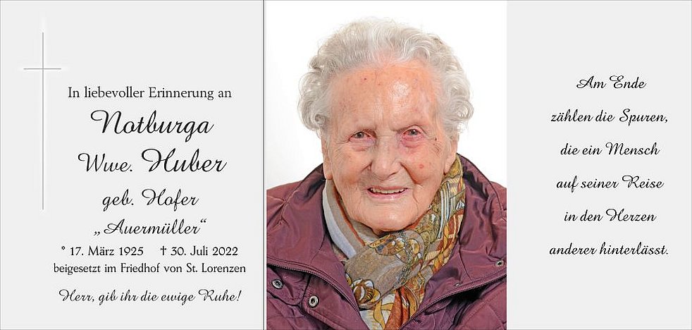 Unsere liebe Mamme ist ab Montagnachmittag in der Friedhofskapelle von St. Lorenzen aufgebahrt.