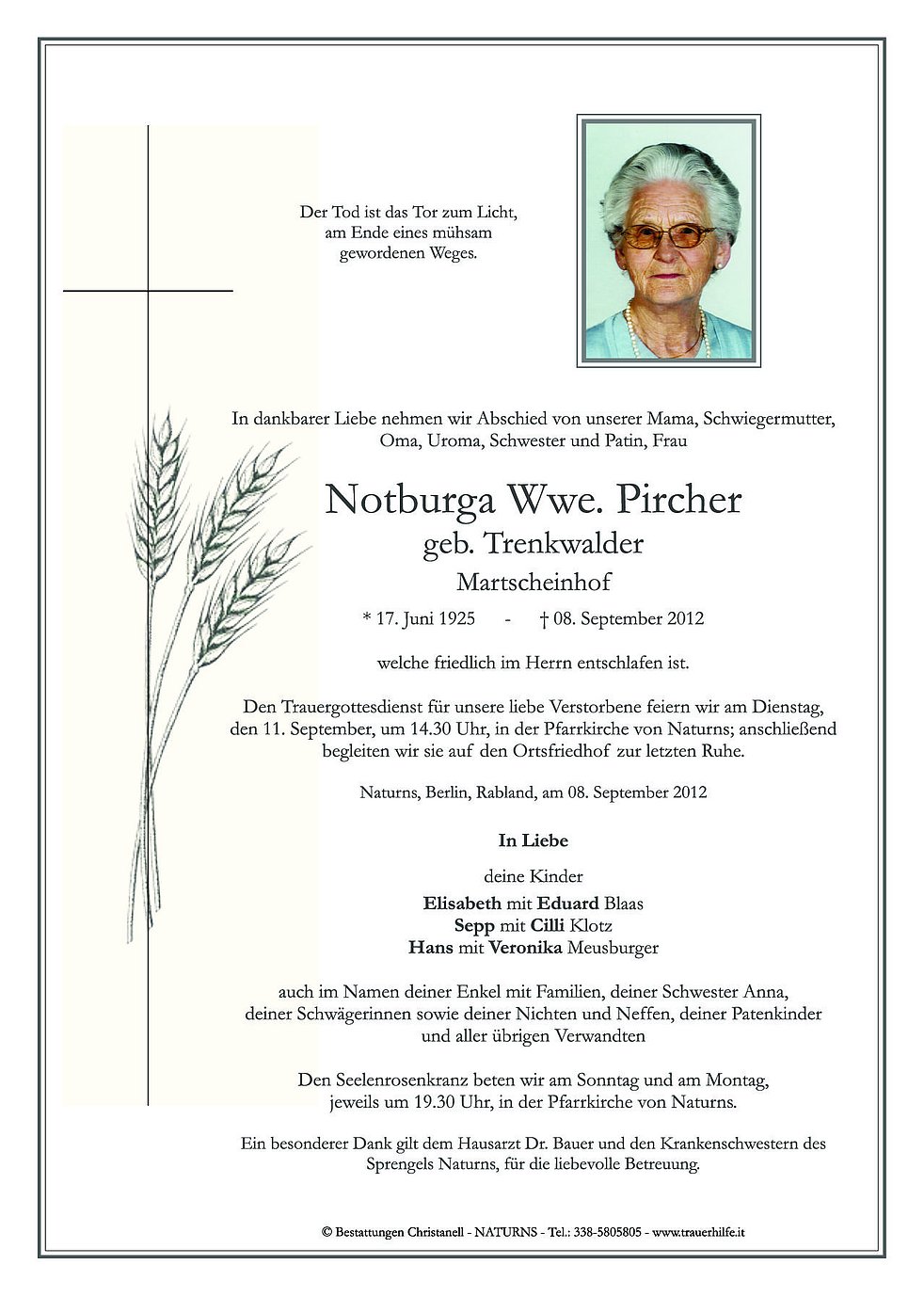 Den Trauergottesdienst für unsere liebe Verstorbene feiern wir am Dienstag, den 11. September, um 14.30 Uhr, in der Pfarrkirche von Naturns; anschließend begleiten wir sie auf den Ortsfriedhof zur letzten Ruhe.