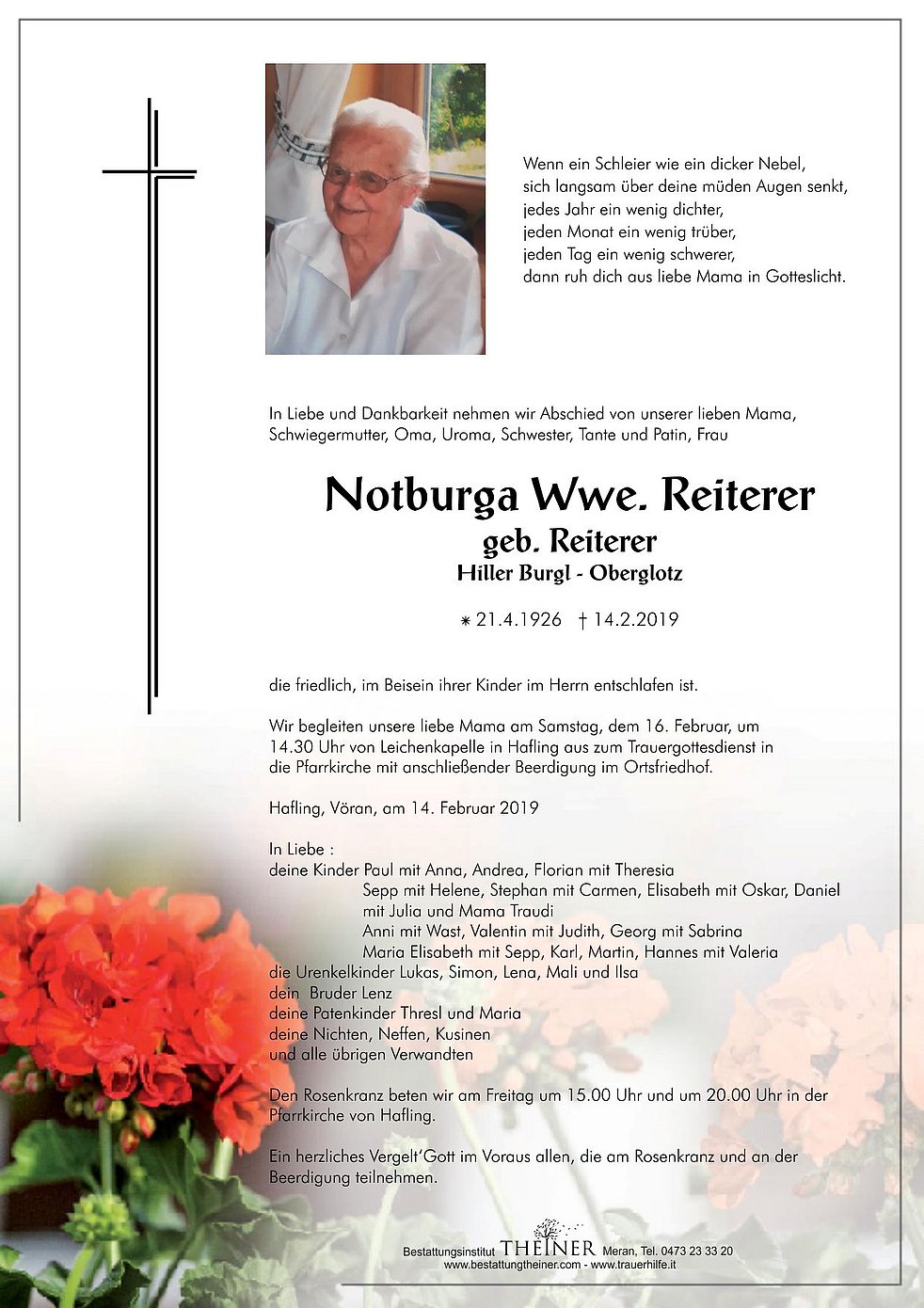 Wir begleiten unsere liebe Mama am Samstag, dem 16. Februar, um 14.30 Uhr von Leichenkapelle in Hafling aus zum Trauergottesdienst in die Pfarrkirche mit anschließender Beerdigung im Ortsfriedhof.