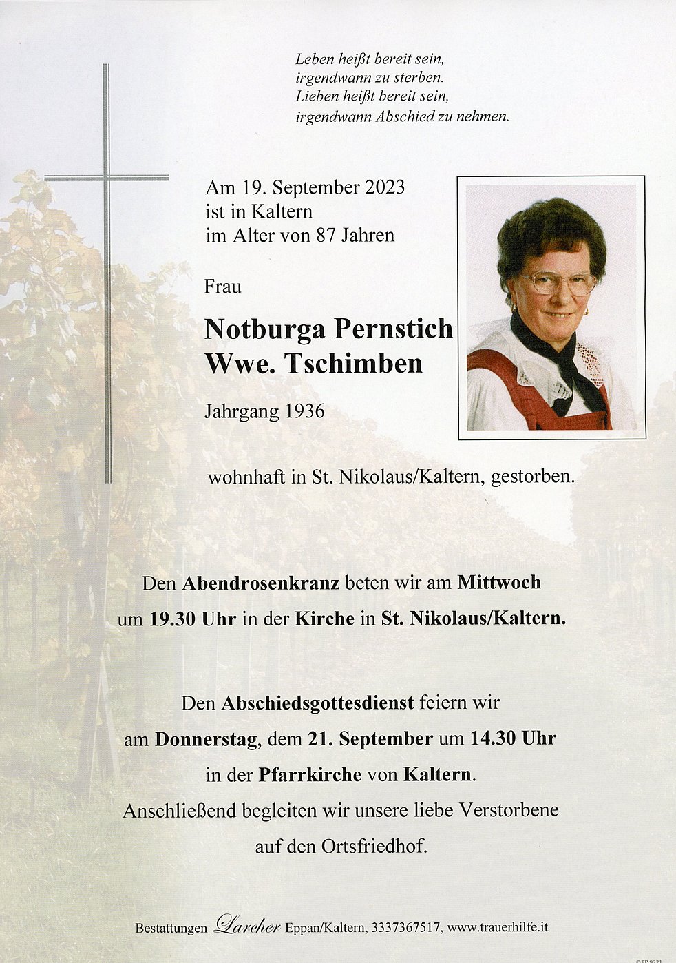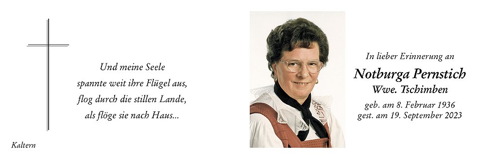Den Abschiedsgottesdienst feiern wir am Donnerstag, dem 21. September um 14.30 Uhr in der Pfarrkirche von Kaltern. Anschließend begleiten wir unsere liebe Verstorbene auf den Ortsfriedhof.
