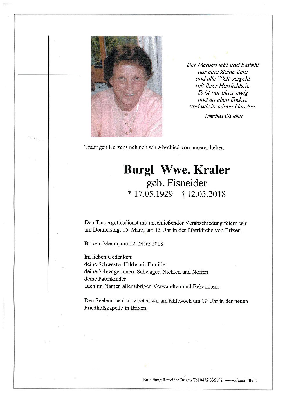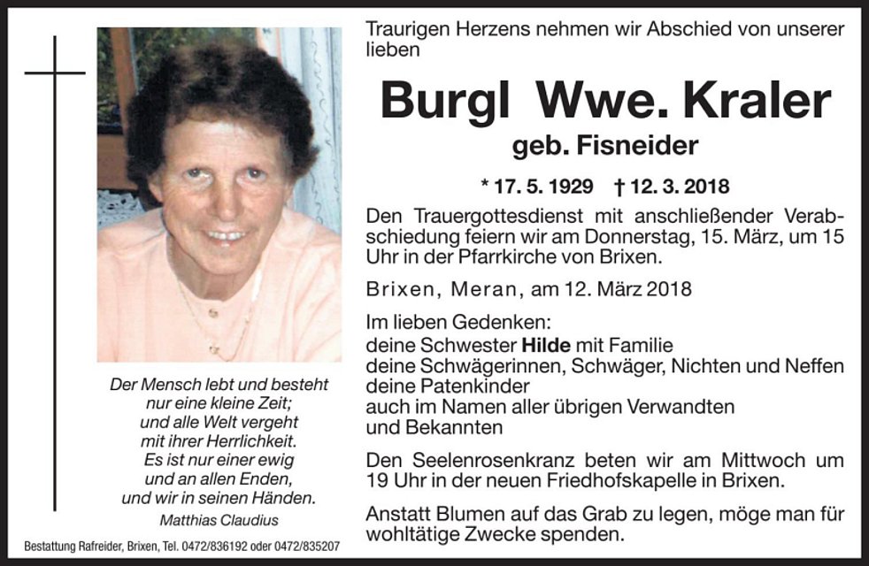 Den Trauergottesdienst mit anschließender Verabschiedung feiern wir am Donnerstag, 15. März, um 15 Uhr in der Pfarrkirche von Brixen.