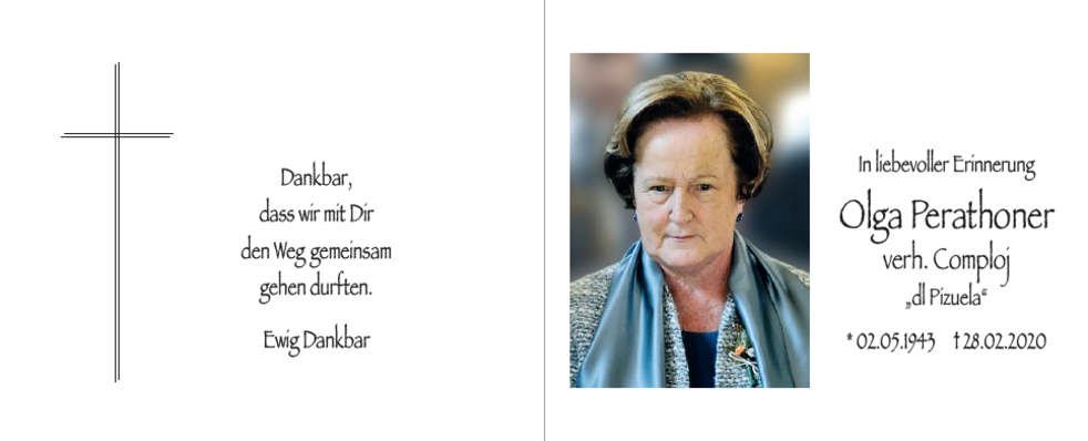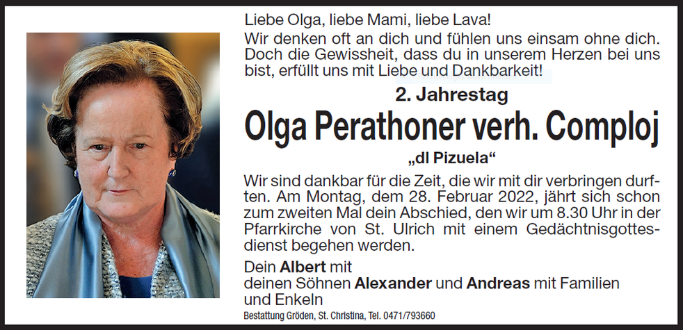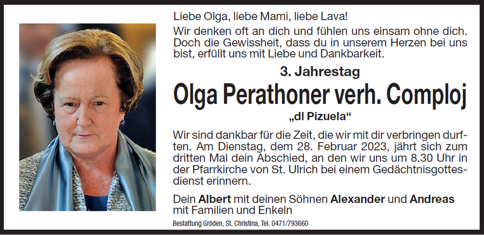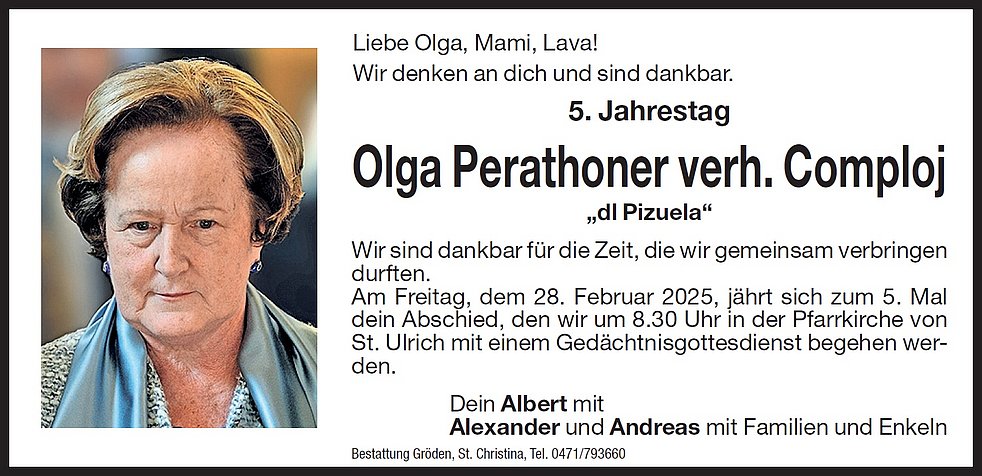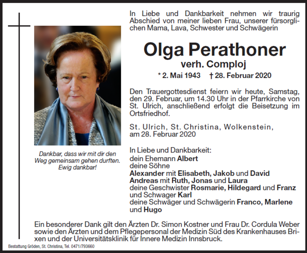 Den Trauergottesdienst feiern wir am Samstag, dem 29 Februar, um 14.30 Uhr in der Pfarrkirche von St. Ulrich, anschließend erfolgt die Beisetzung im Ortsfriedhof.