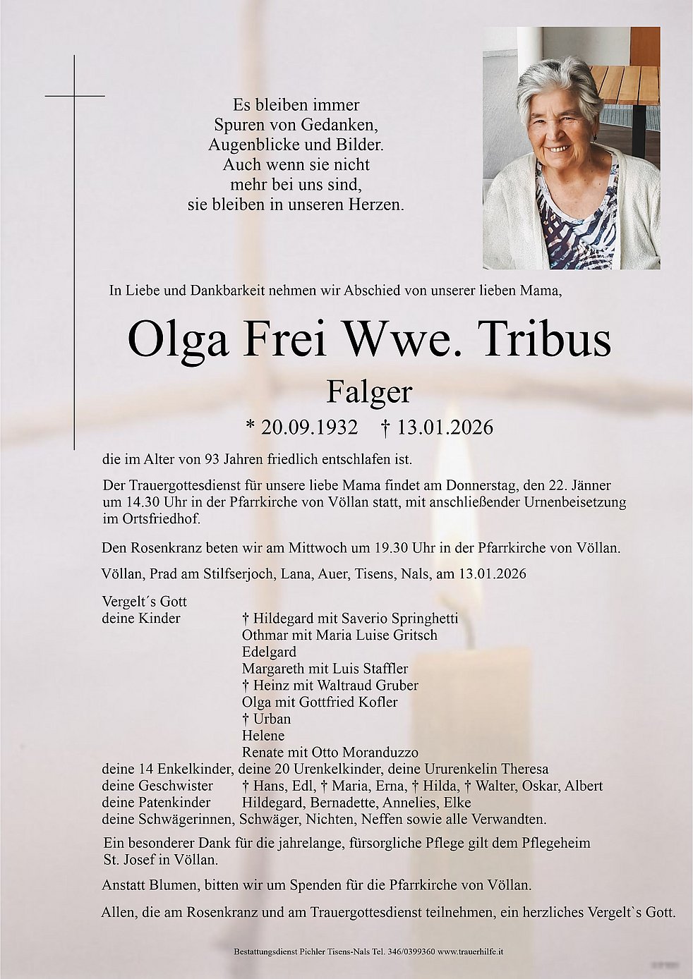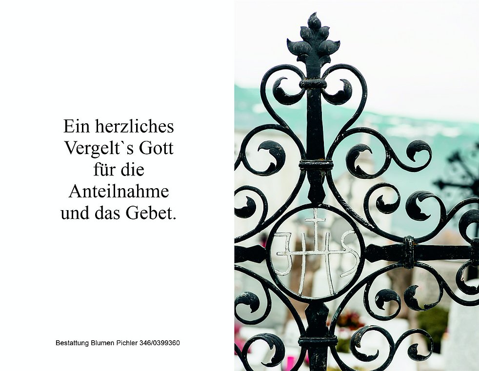 Lieber Othmar ,das dicke Lebensbuch deiner Mama ist nun zugeschlagen. Es ist ihr Buch gefüllt mit vielen Erfahrungen und Begebenheiten ihres sehr langen Lebens. Manche Seiten darin kennst du , manche Seiten hast du selbst mitgeschrieben. Doch niemand kennt alle Seiten ,die Fragen und Sehnsüchte , die Hoffnungen das Leid und all das Unausgesprochene. Das alles ist enthalten in diesem Buch das nun geschlossen ist. Einer aber kennt den vollen Inhalt, kennt alle Seiten , es ist unser Gott . Der Gott des Lebens jeden Tag und jeden Augenblick , aber auch in dunklen Stunden und über den Tod hinaus wird er eure Mama auf ewig in seiner Hand halten.