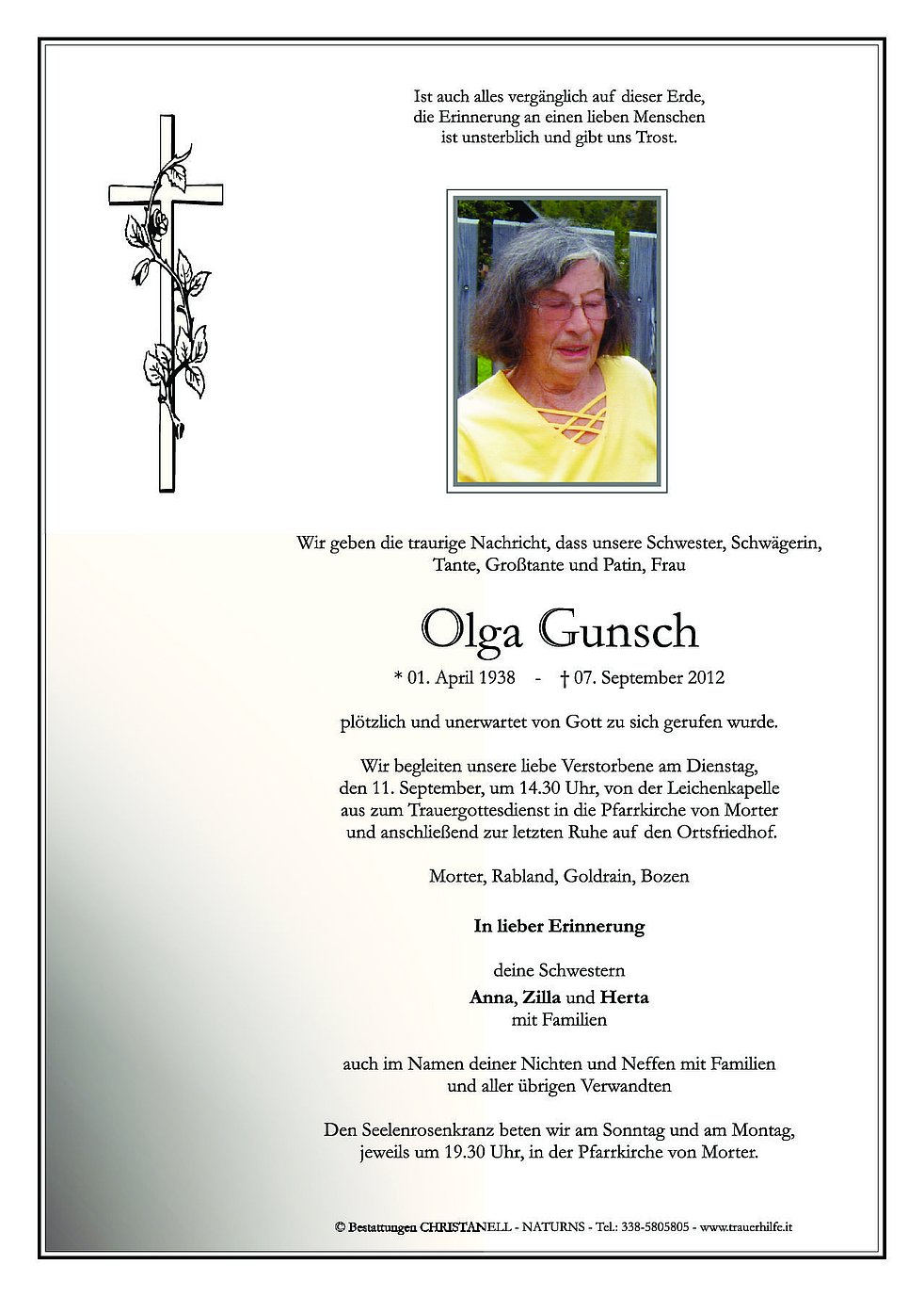 Wir begleiten unsere liebe Verstorbene am Dienstag, den 11. September, um 14.30 Uhr, von der Leichenkapelle aus zum Trauergottesdienst in die Pfarrkirche von Morter und anschließend zur letzten Ruhe auf den Ortsfriedhof.