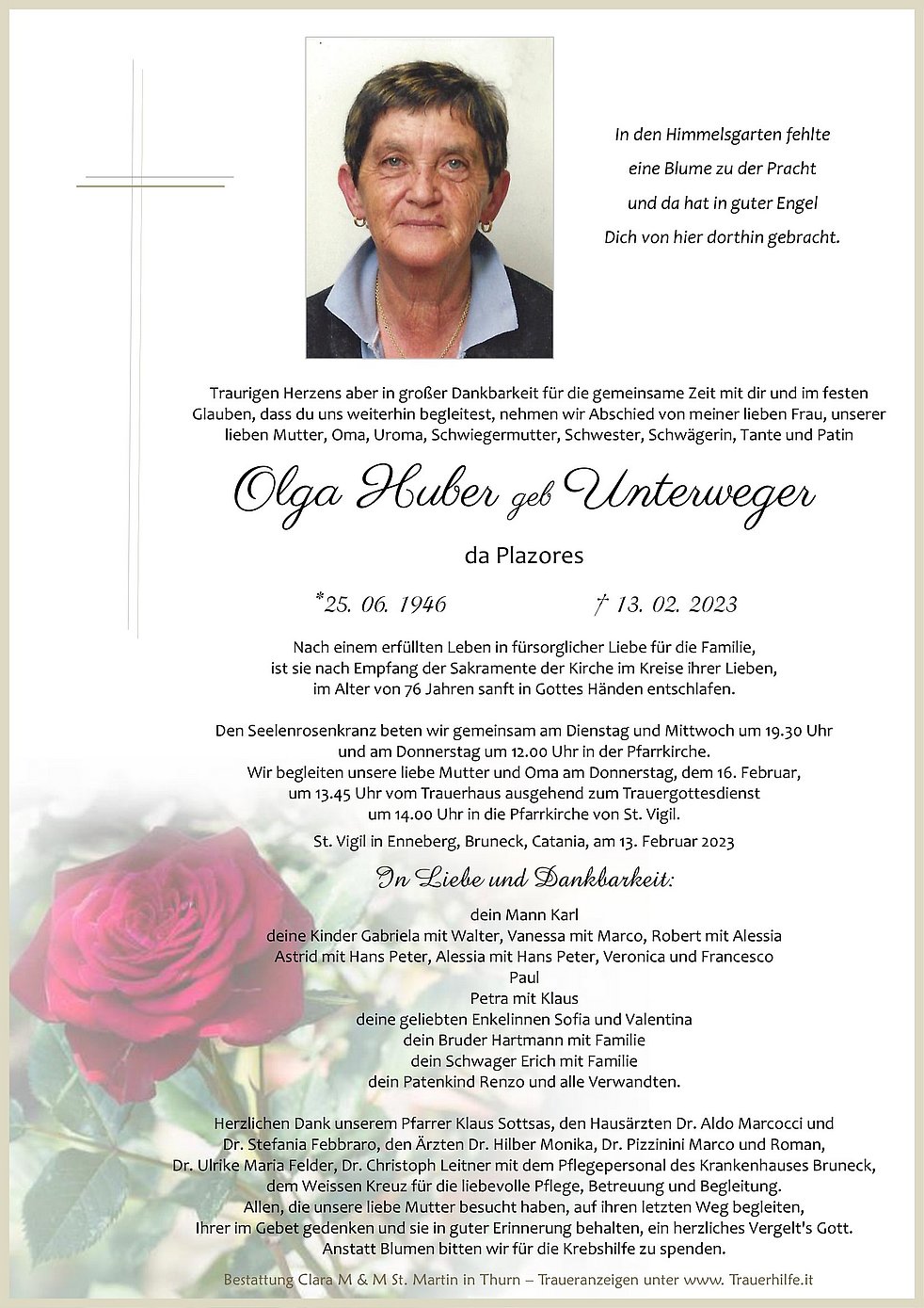 Wir begleiten unsere liebe Mutter und Oma am Donnerstag, dem 16. Februar, um 13.45 Uhr vom Trauerhaus ausgehend zum Trauergottesdienst um 14.00 Uhr in die Pfarrkirche von St. Vigil.