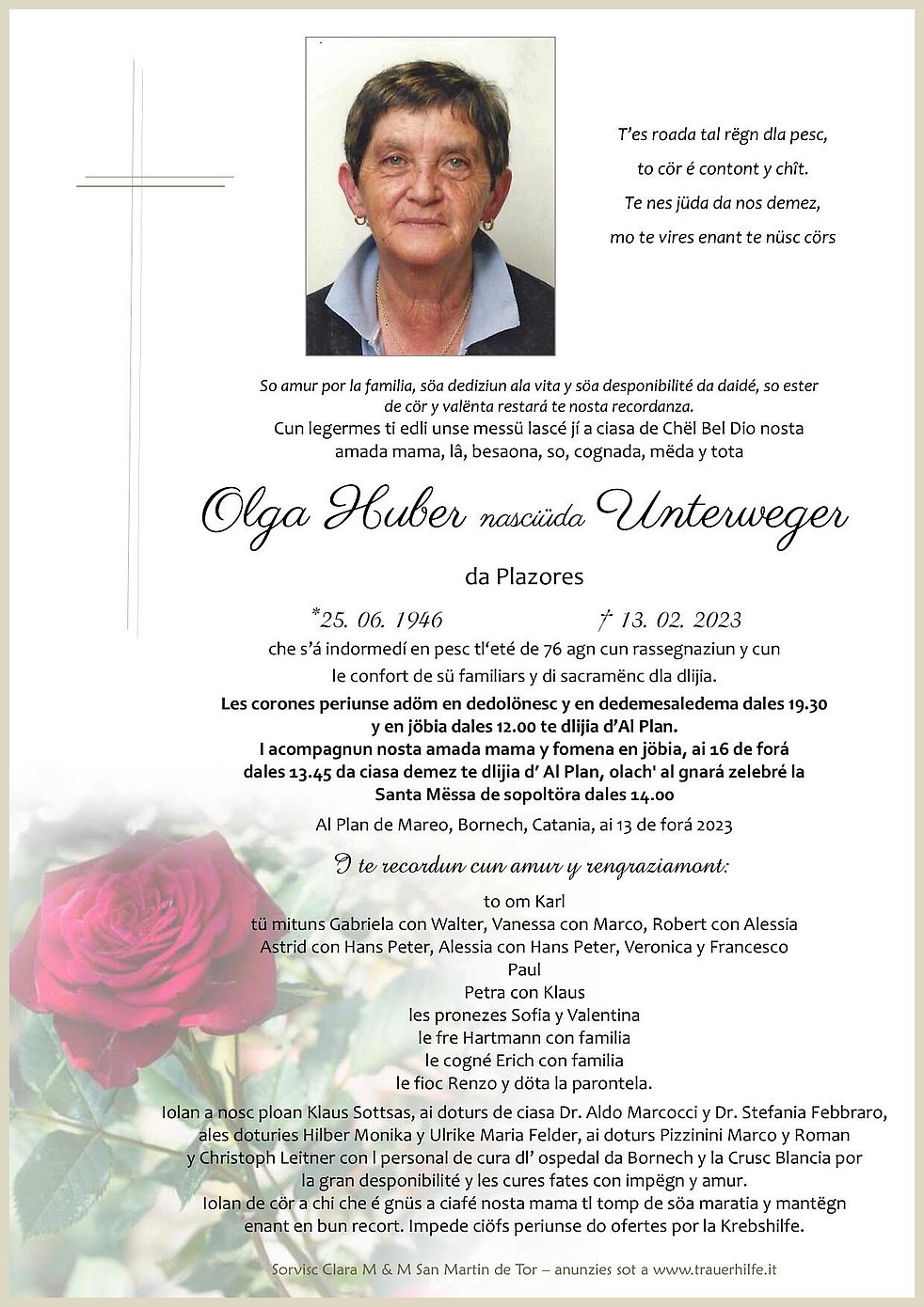 Nach einem erfüllten Leben in fürsorglicher Liebe für die Familie, ist sie nach Empfang der Sakramente der Kirche im Kreise ihrer Lieben, im Alter von 76 Jahren sanft in Gottes Händen entschlafen.