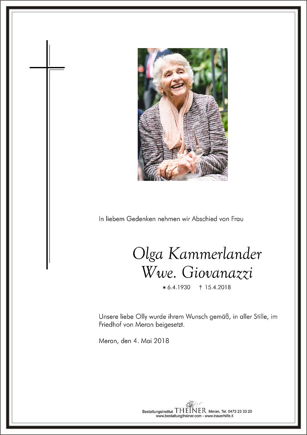 Unsere liebe Olly wurde ihrem Wunsch gemäß, in aller Stille, im Friedhof von Meran beigesetzt.