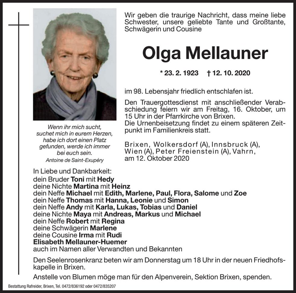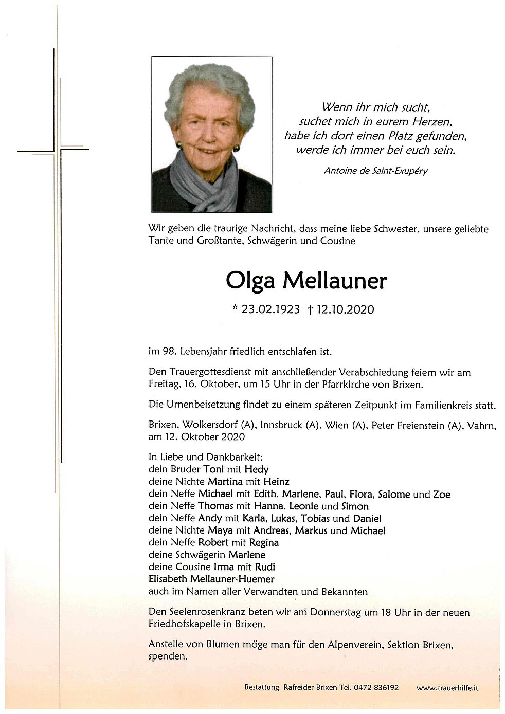 Anstelle von Blumen möge man für den Alpenverein, Sektion Brixen, spenden.