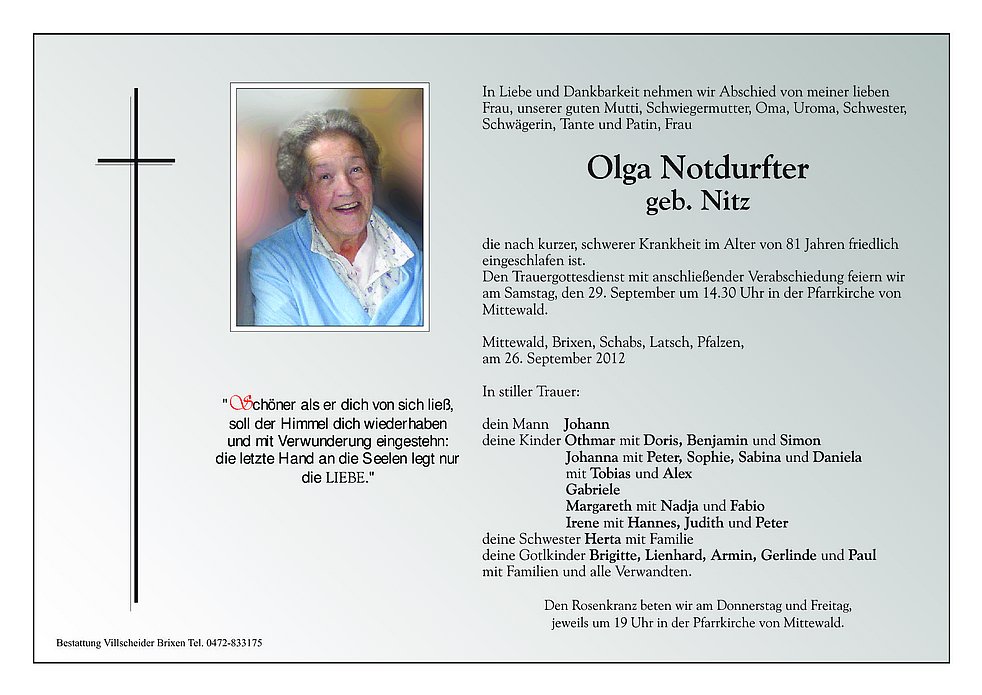 Den Trauergottesdienst mit anschließender Verabschiedung feiern wir am Samstag, den 29. September um 14.30 Uhr in der Pfarrkirche von Mittewald.