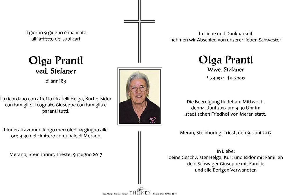 Die Beerdigung findet am Mittwoch, den 14. Juni 2017 um 9.30 Uhr im städtischen Friedhof von Meran statt.