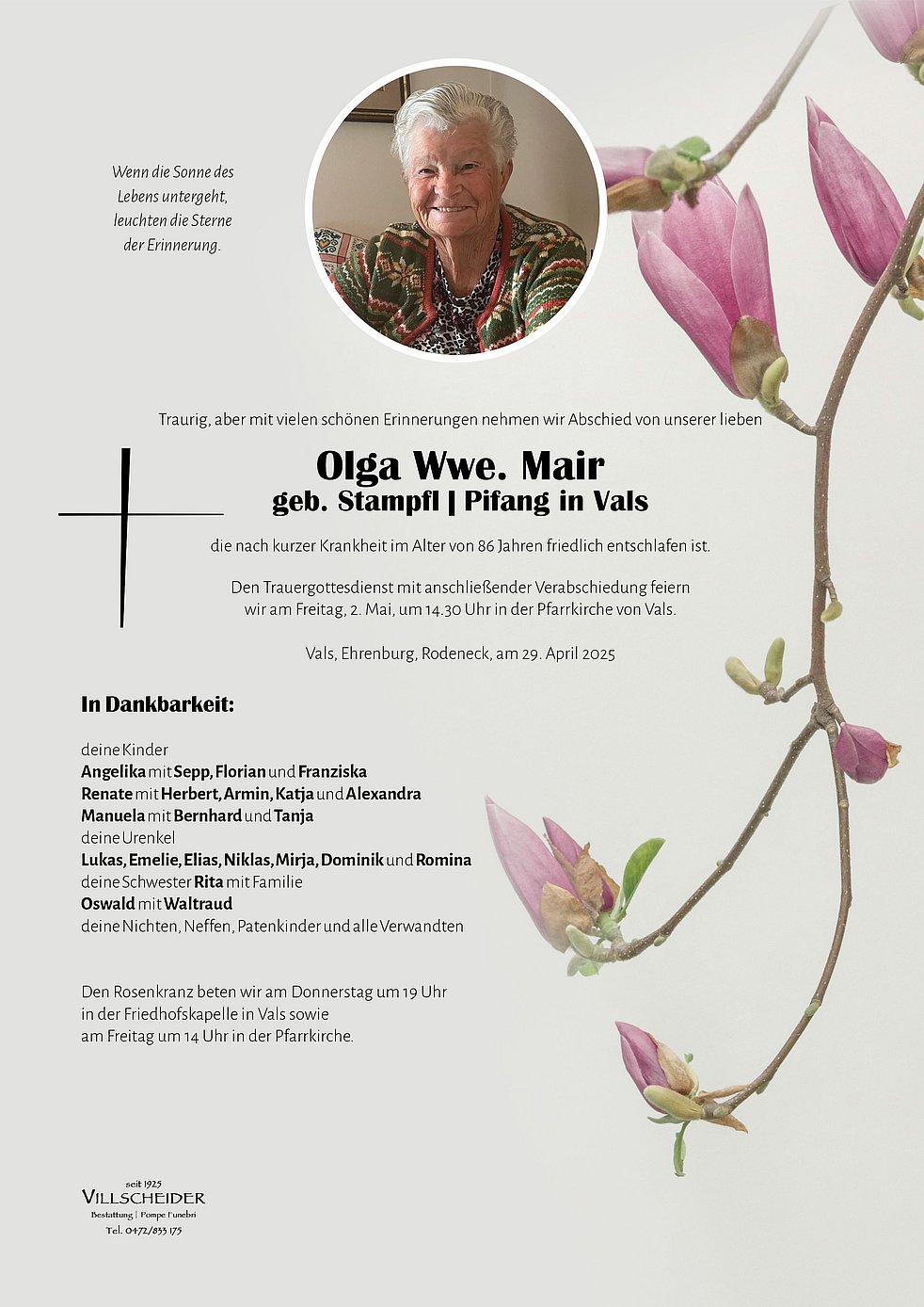 Begräbnisgottesdienst: 02.05. - 14:30 Uhr Vals