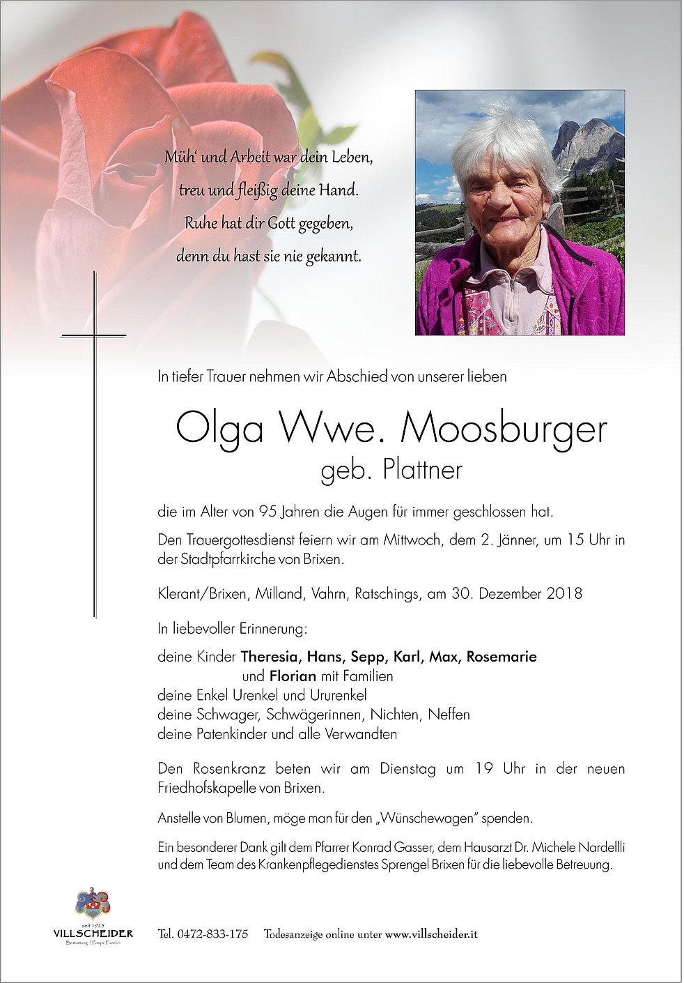 Begräbnisgottesdienst: 02.01. - 15:00 Uhr Brixen
