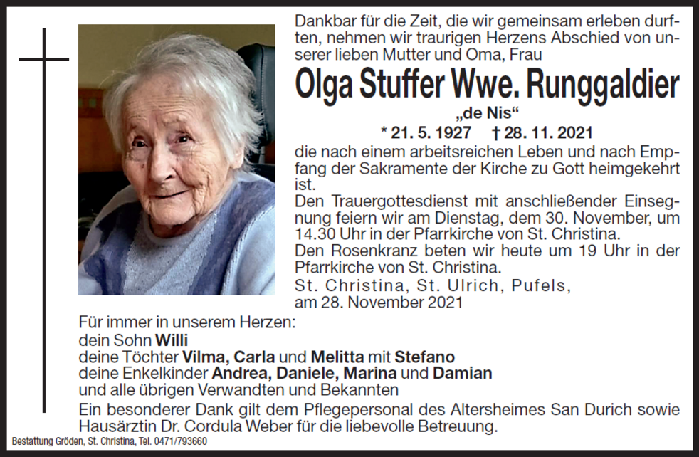 Ein besonderer Dank gilt dem Pflegepersonal des Altersheimes San Durich sowie Hausärztin Dr. Cordula Weber für die liebevolle Betreuung.