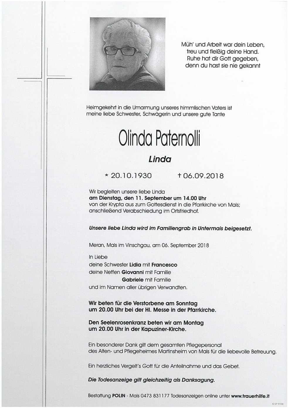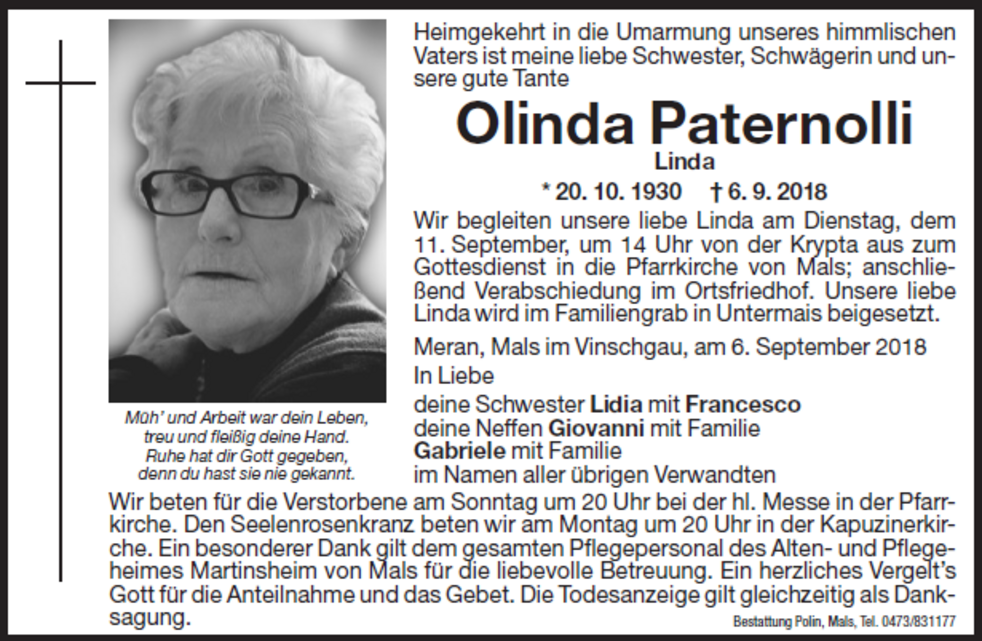 Unsere liebe Linda wird im Familiengrab in Untermais beigesetzt.