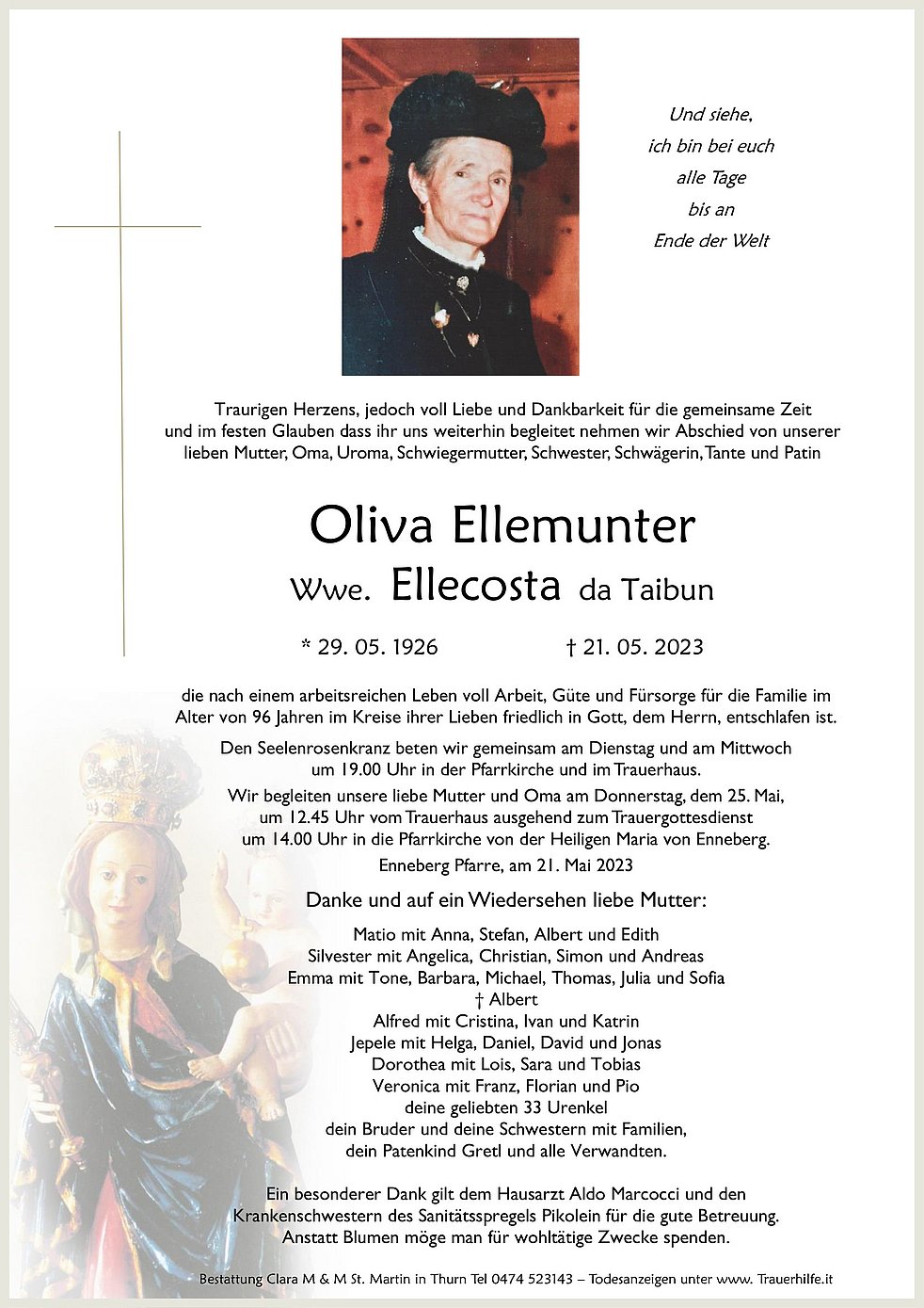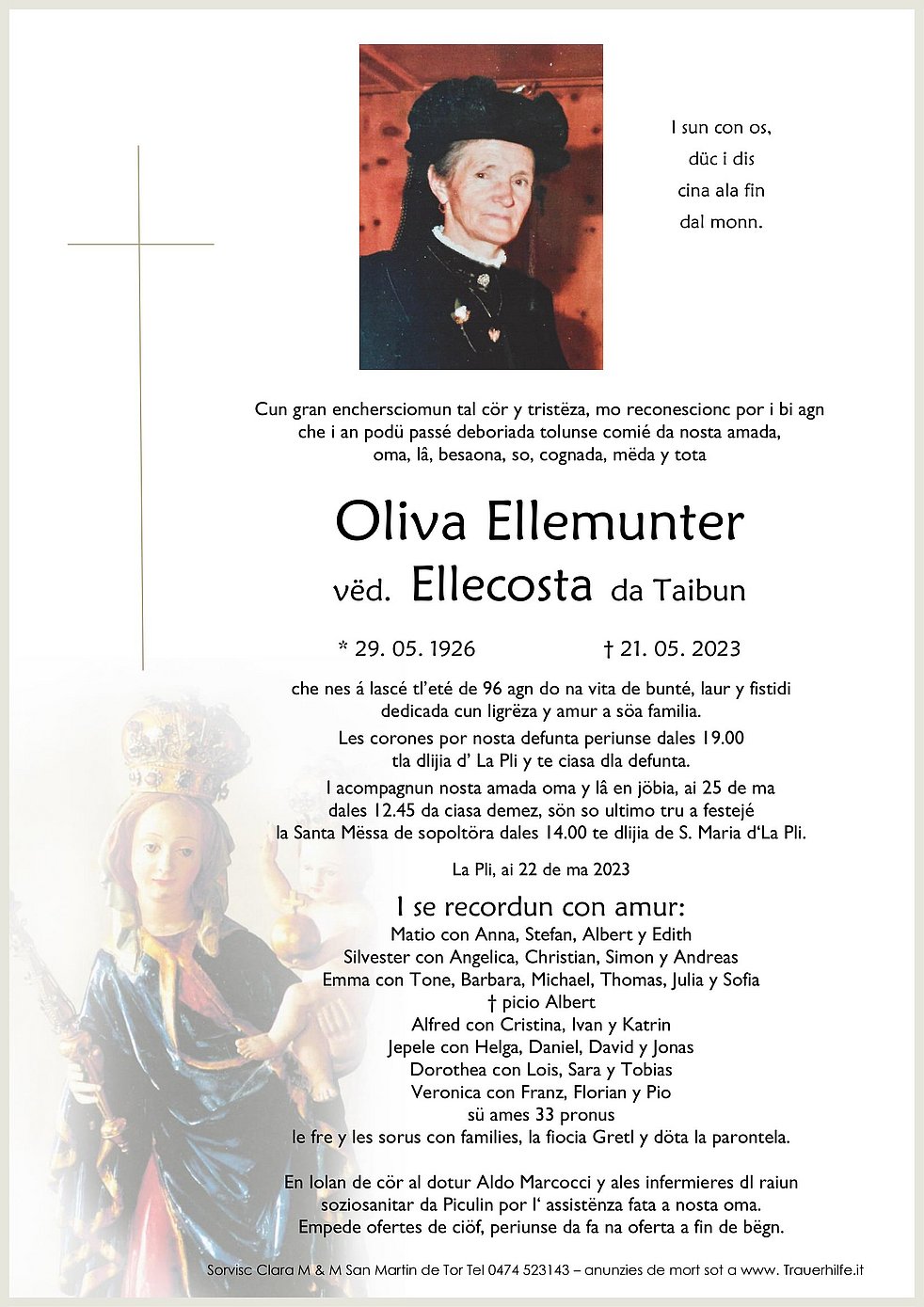 die nach einem arbeitsreichen Leben voll Arbeit, Güte und Fürsorge für die Familie im Alter von 96 Jahren im Kreise ihrer Lieben friedlich in Gott, dem Herrn, entschlafen ist.
