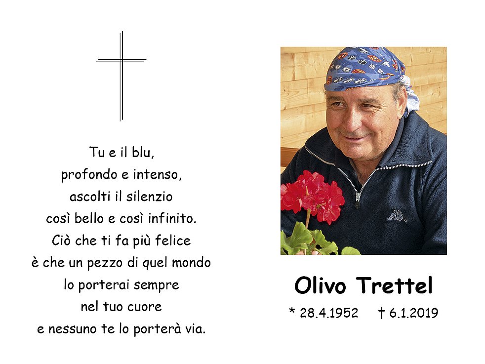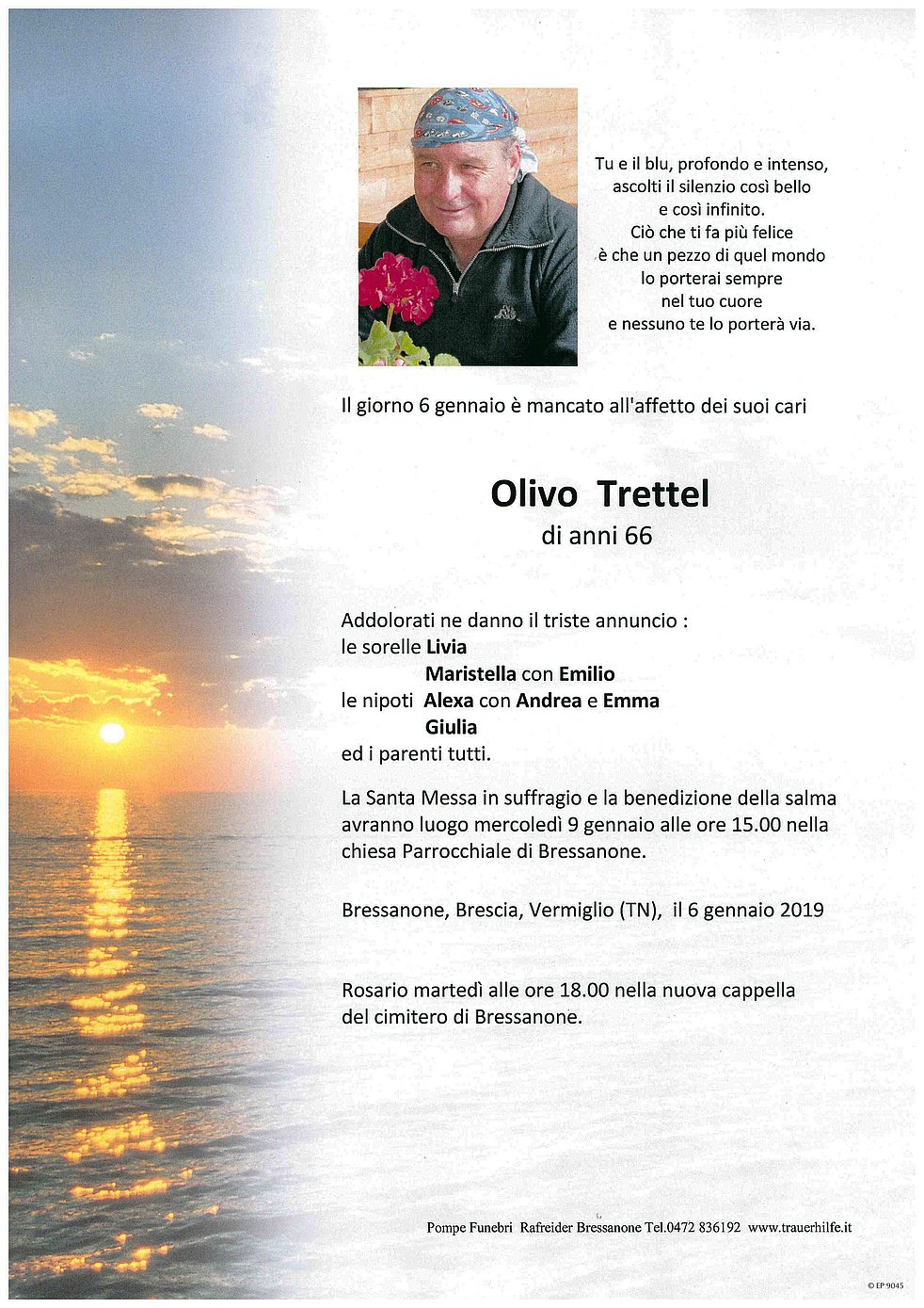 La Santa Messa in suffragio e la benedizione della salma avranno luogo mercoledì 9 gennaio alle ore 15.00 nella chiesa Parrocchiale di Bressanone.