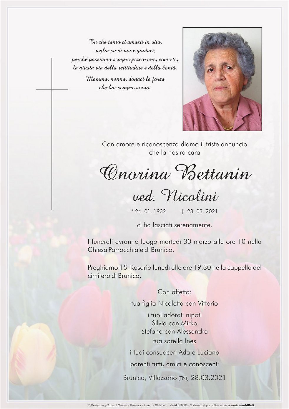 I funerali avranno luogo martedì 30 marzo alle ore 10 nella Chiesa Parrocchiale di Brunico.
