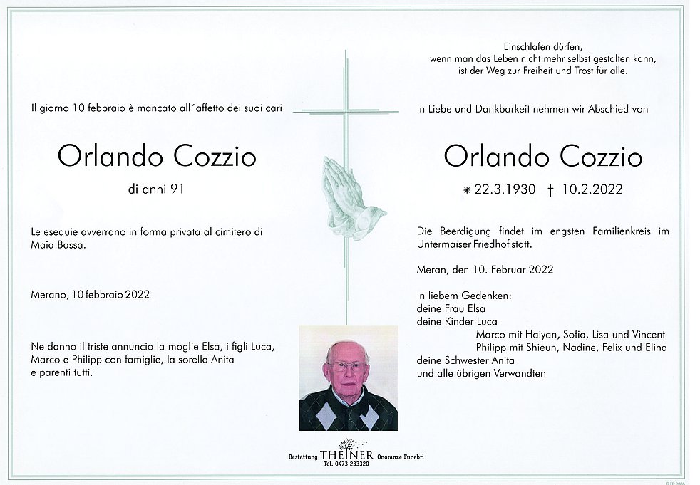 Ne danno il triste annuncio la moglie Elsa, i figli Luca, Marco e Philipp con famiglie, la sorella Anita e parenti tutti.