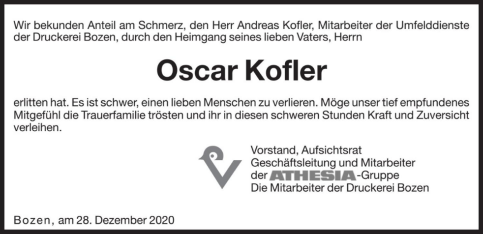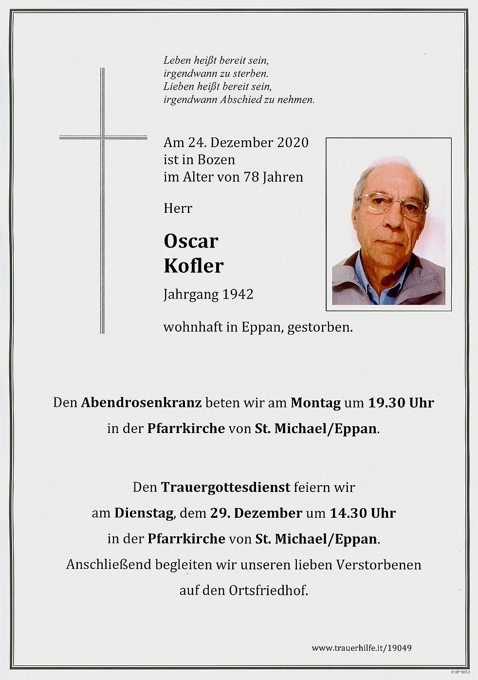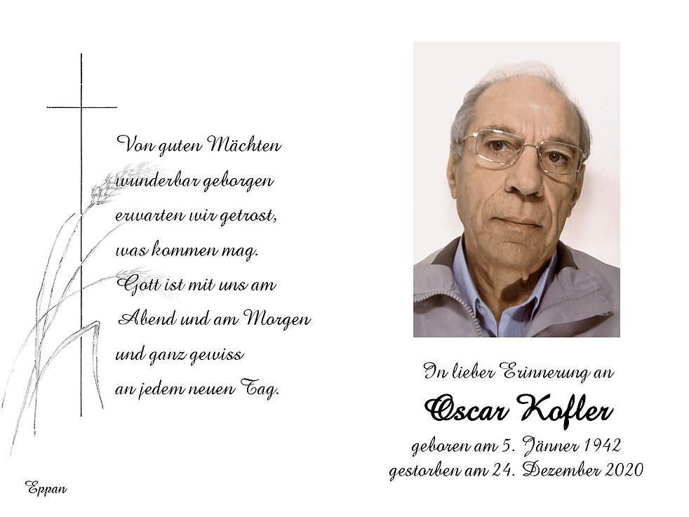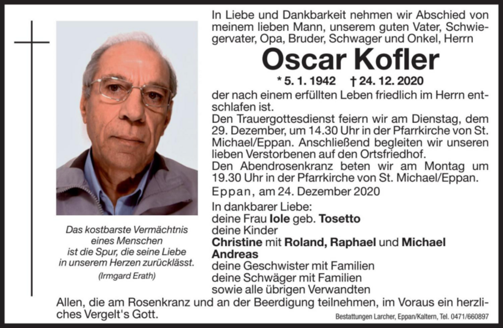 Den Trauergottesdienst feiern wir am Dienstag, dem 29. Dezember um 14.30 Uhr in der Pfarrkirche von St. Michael/Eppan. Anschließend begleiten wir unseren lieben Verstorbenen auf den Ortsfriedhof.