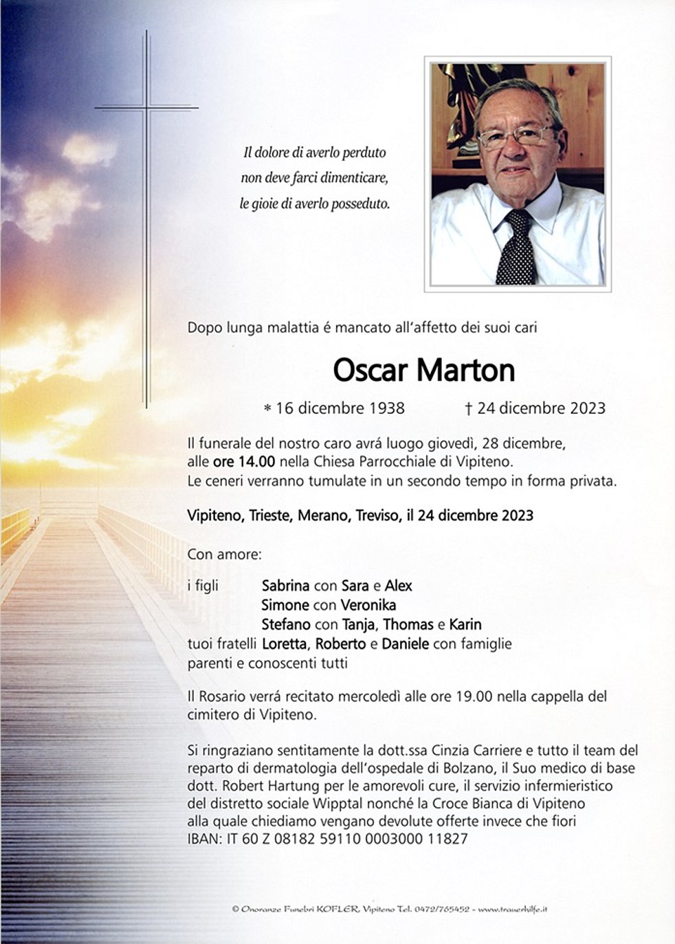 Il funerale del nostro caro avrá luogo giovedì, 28 dicembre, alle ore 14.00 nella Chiesa Parrocchiale di Vipiteno. Le ceneri verranno tumulate in un secondo tempo in forma privata.