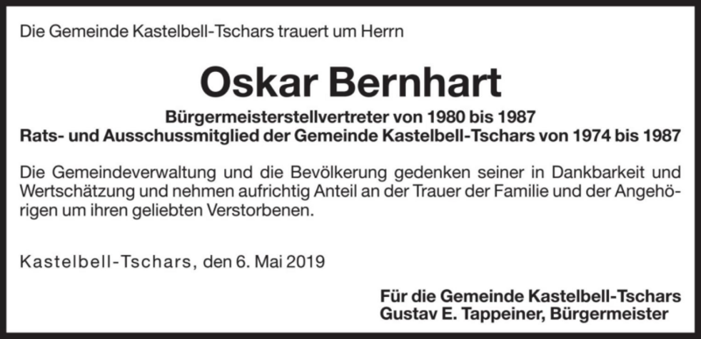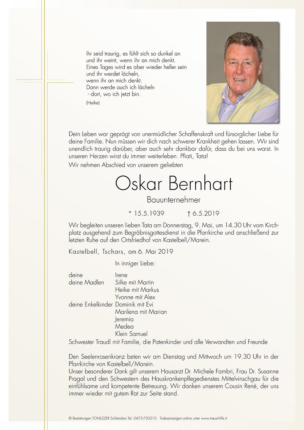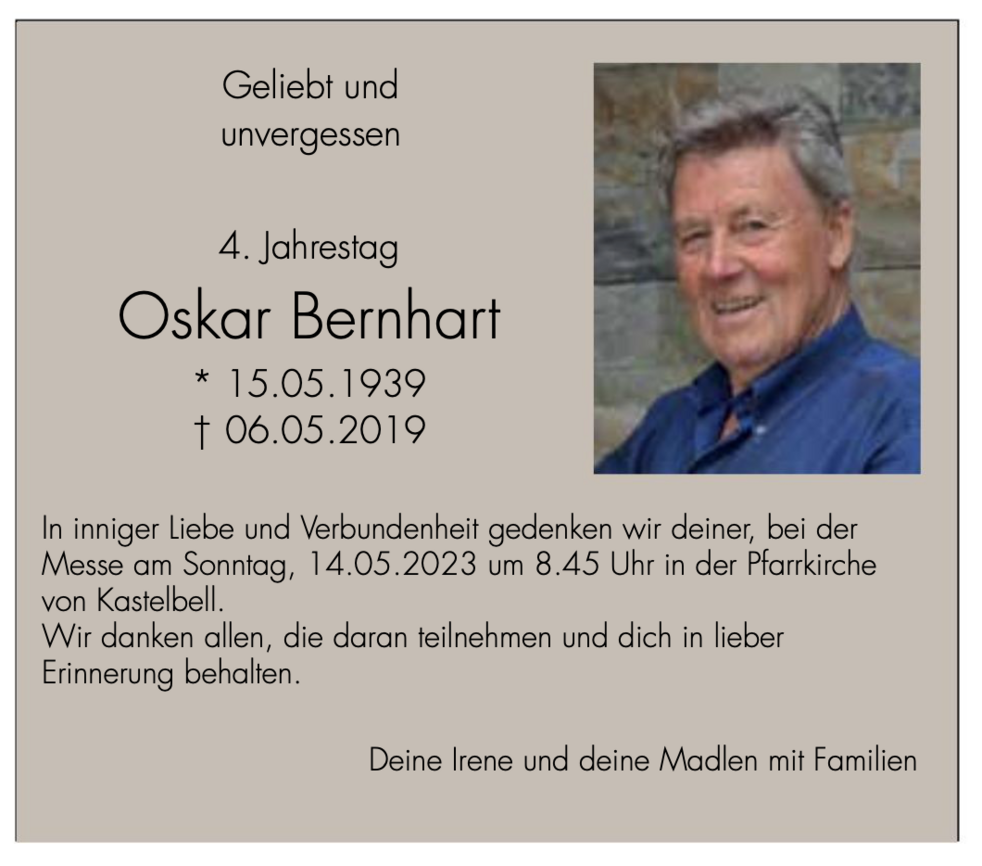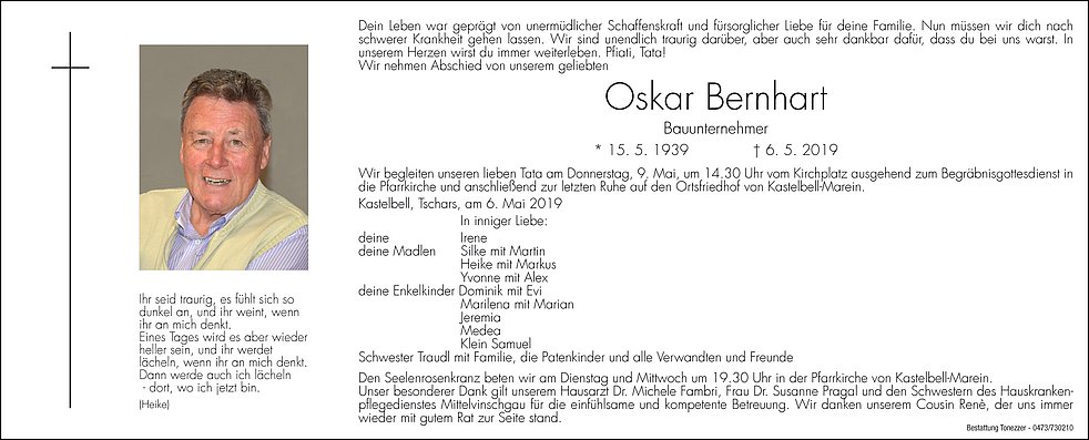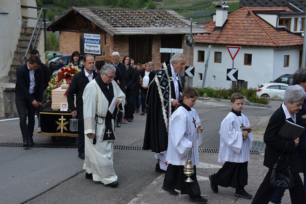Wir begleiten unseren lieben Tata am Donnerstag, 9. Mai, um 14.30 Uhr vom Kirchplatz ausgehend zum Begräbnisgottesdienst in die Pfarrkirche und anschließend zur letzten Ruhe auf den Ortsfriedhof von Kastelbell/Marein.