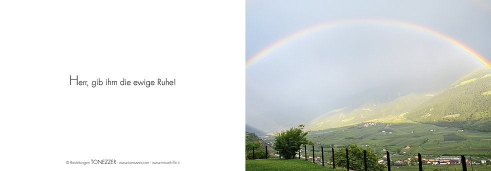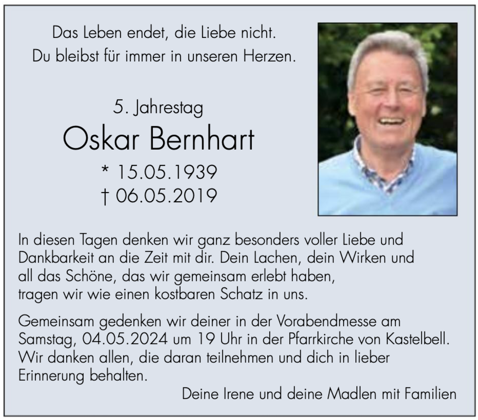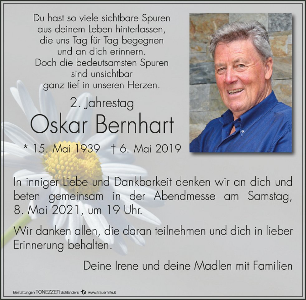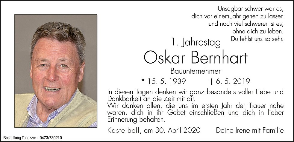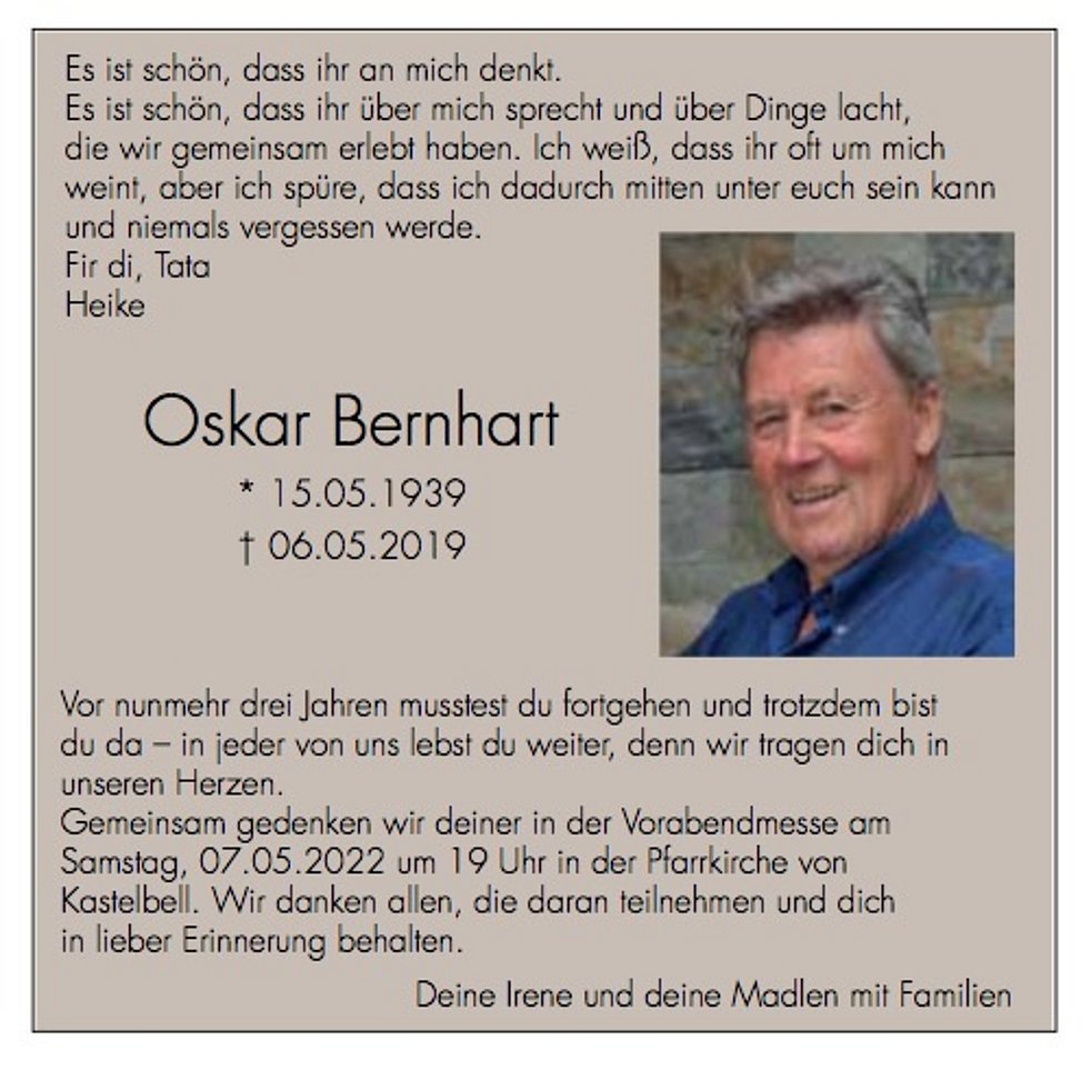 Wir begleiten unseren lieben Tata am Donnerstag, 9. Mai, um 14.30 Uhr vom Kirchplatz ausgehend zum Begräbnisgottesdienst in die Pfarrkirche und anschließend zur letzten Ruhe auf den Ortsfriedhof von Kastelbell/Marein.