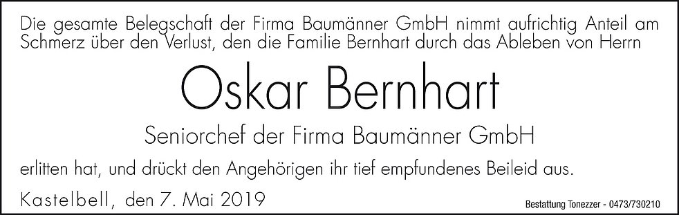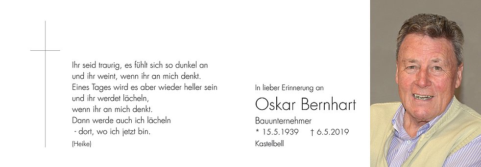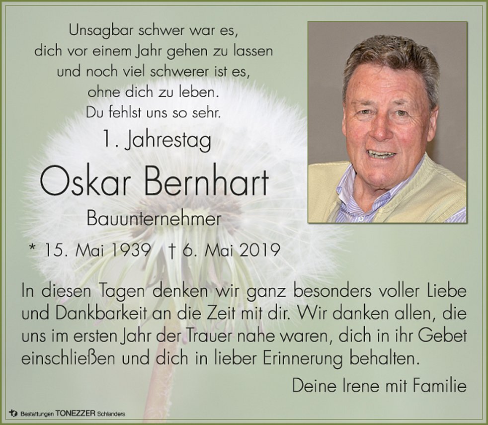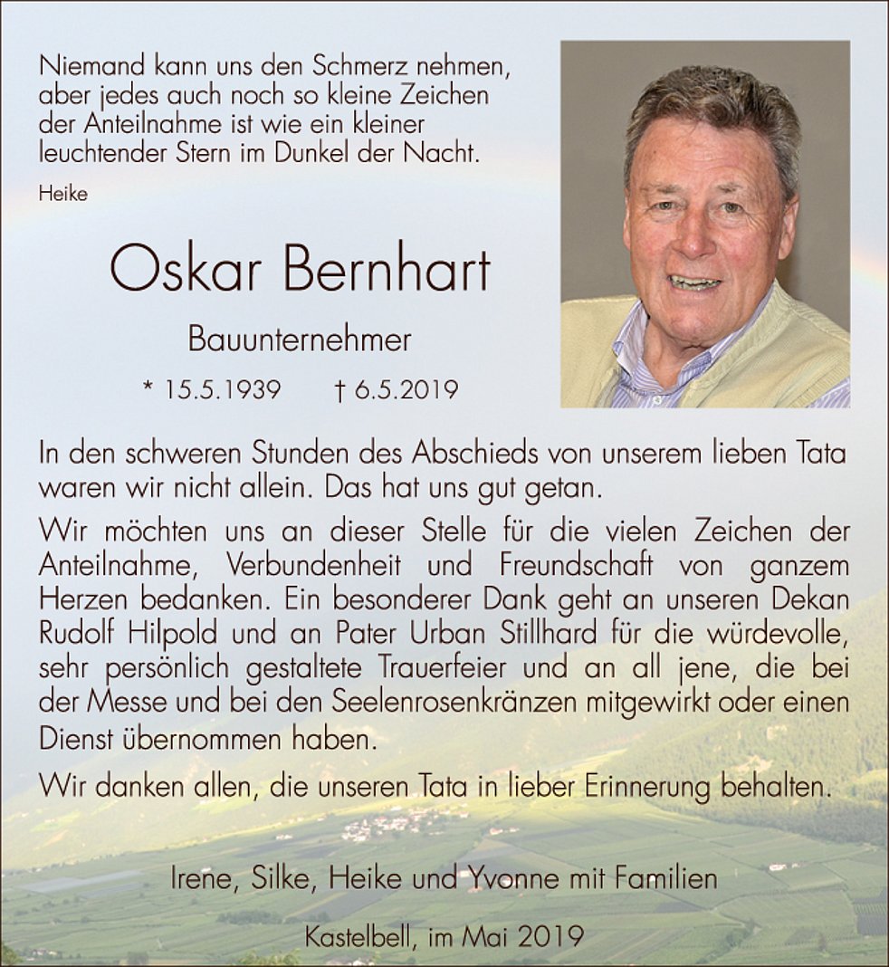 Dein Leben war geprägt von unermüdlicher Schaffenskraft und fürsorglicher Liebe für deine Familie. Nun müssen wir dich nach schwerer Krankheit gehen lassen. Wir sind unendlich traurig darüber, aber auch sehr dankbar dafür, dass du bei uns warst. In unseren Herzen wirst du immer weiterleben. Pfiati, Tata! Wir nehmen Abschied von unserem geliebten