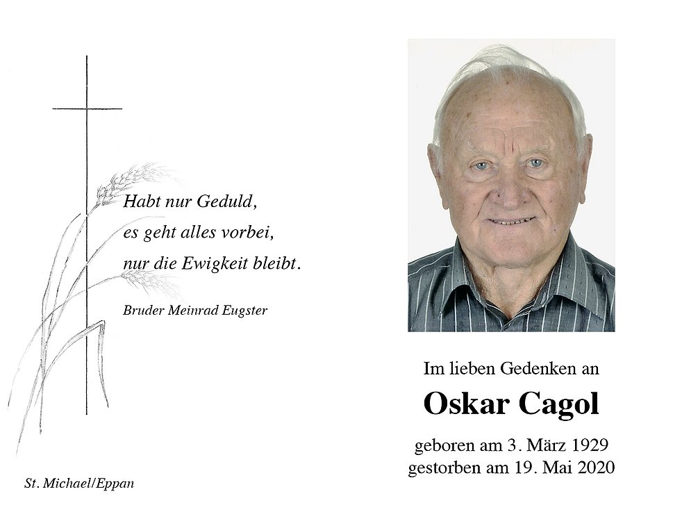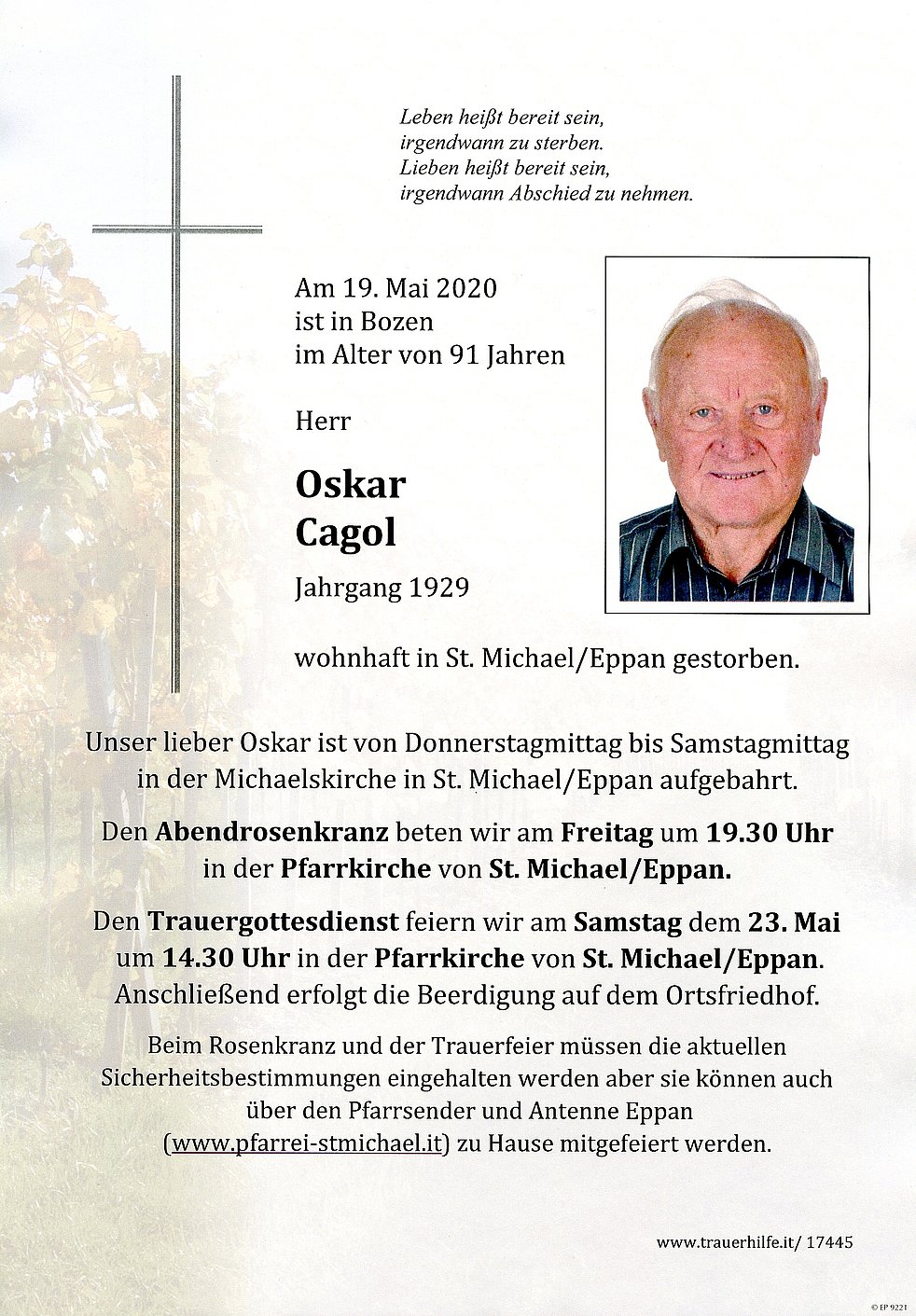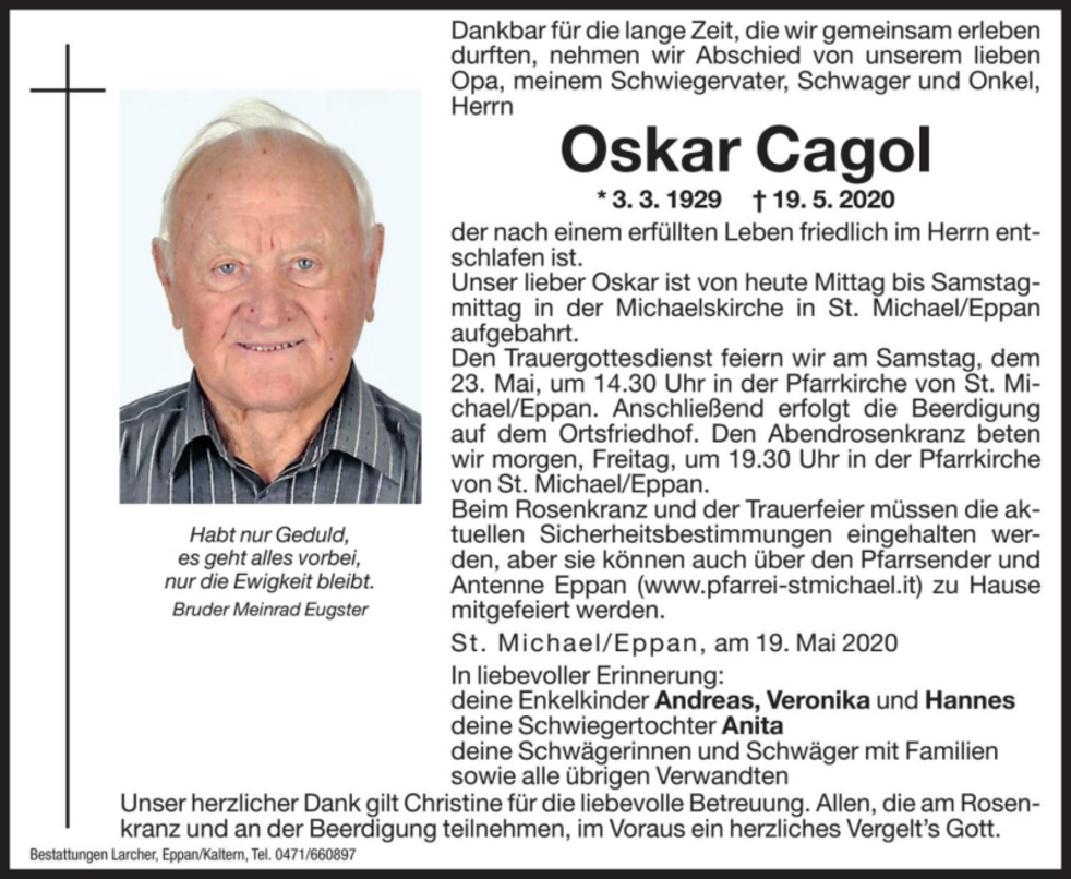 Den Trauergottesdienst feiern wir am Samstag, dem 23. Mai um 14.30 Uhr in der Pfarrkirche von St. Michael/Eppan. Anschließend erfolgt die Beerdigung auf dem Ortsfriedhof.