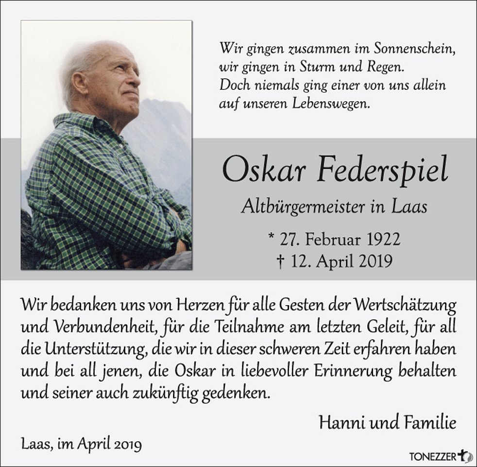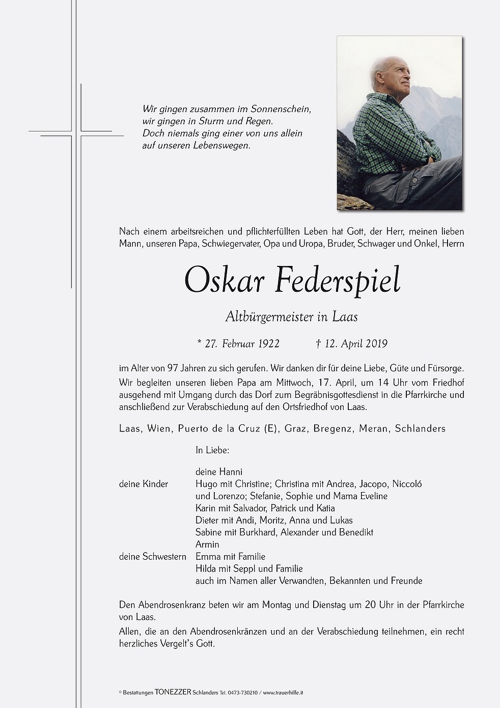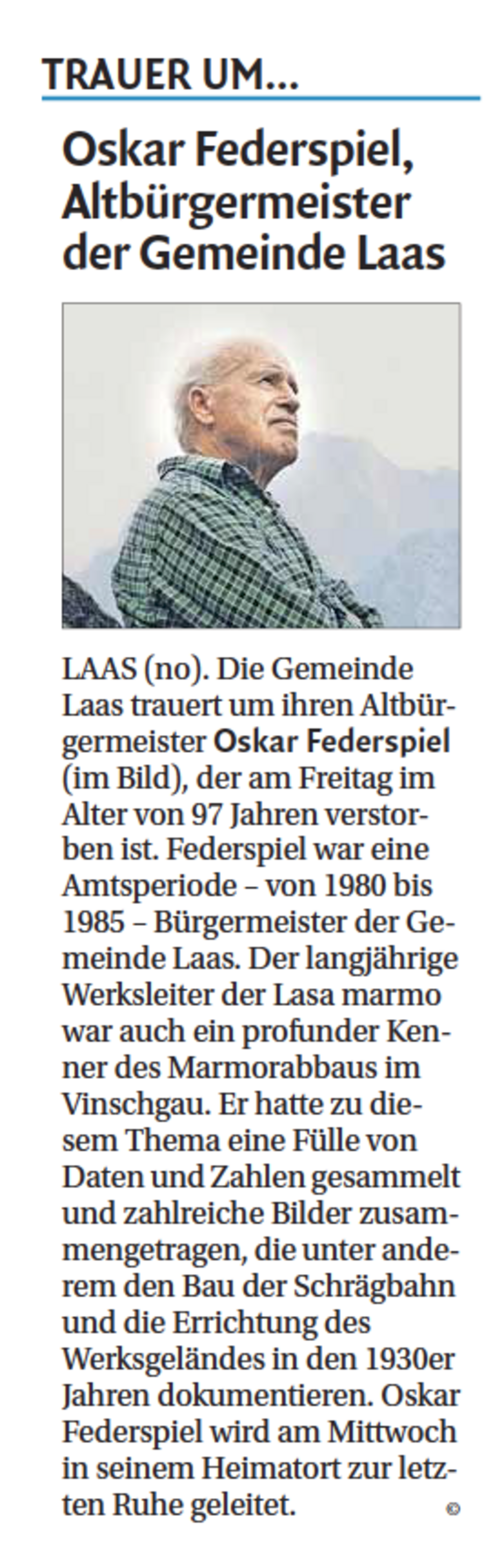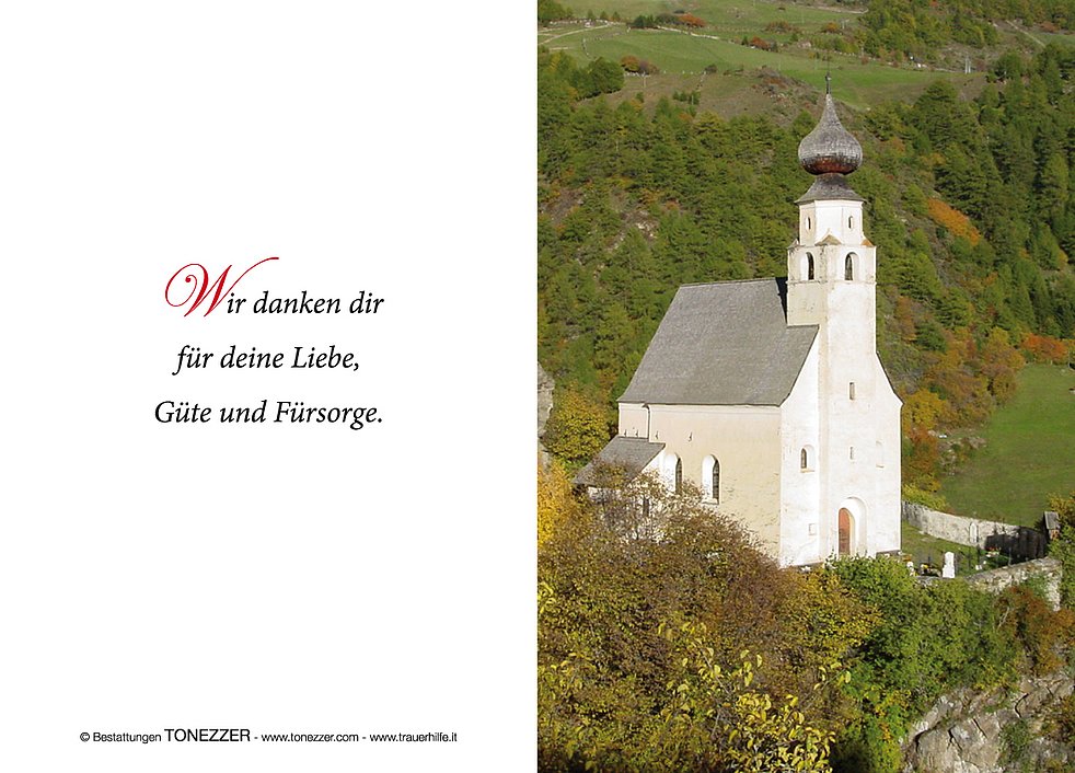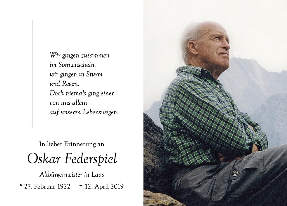 Wir begleiten unseren lieben Papa am Mittwoch, 17. April, um 14 Uhr vom Friedhof ausgehend mit Umgang durch das Dorf zum Begräbnisgottesdienst in die Pfarrkirche und anschließend zur Verabschiedung auf den Ortsfriedhof von Laas.