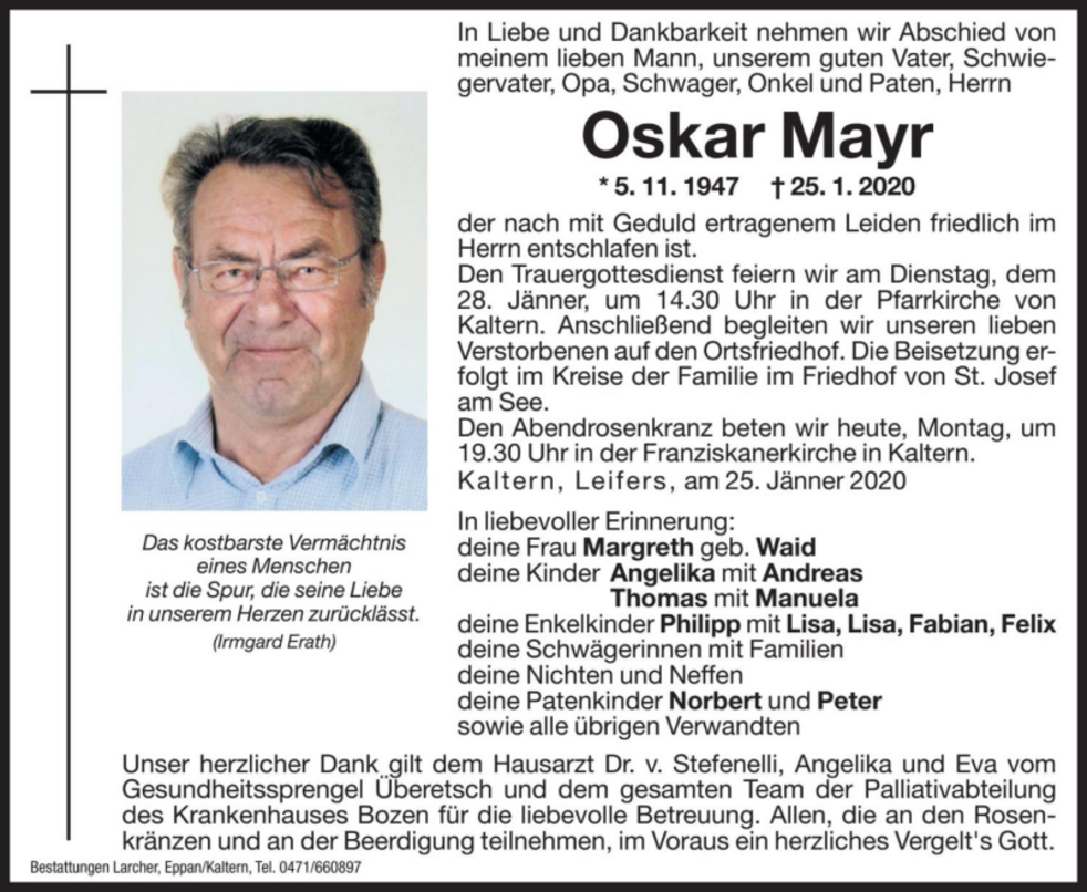 Den Trauergottesdienst feiern wir am Dienstag, dem 28. Jänner, um 14.30 Uhr in der Pfarrkirche von Kaltern. Anschließend begleiten wir unseren lieben Verstorbenen auf den Ortsfriedhof. Die Beisetzung erfolgt im Kreise der Familie im Friedhof von St. Josef am See.