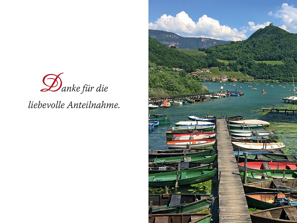 Unser herzlicher Dank gilt dem Hausarzt Dr. v. Stefenelli, Angelika und Eva vom Gesundheitssprengel Überetsch und dem gesamten Team der Palliativabteilung des Krankenhauses Bozen für die liebevolle Betreuung.